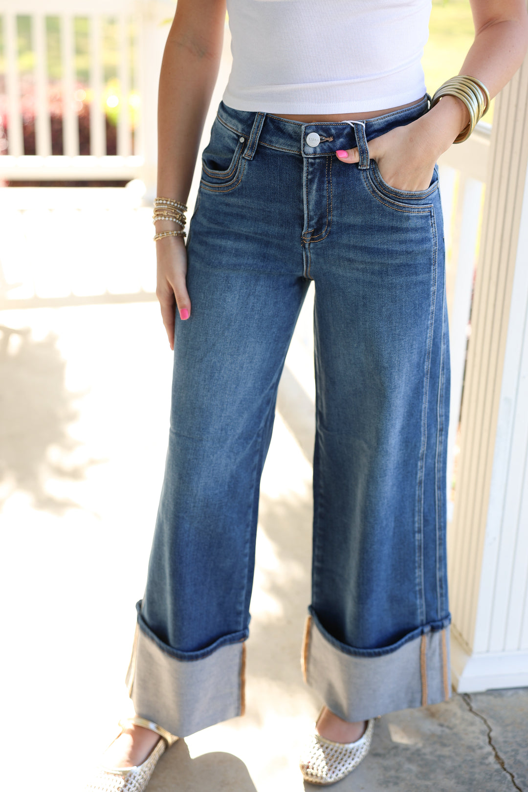Risen - High Rise Wide Leg Cuffed Jeans W/ Double Front Pocket Detail "Dark"