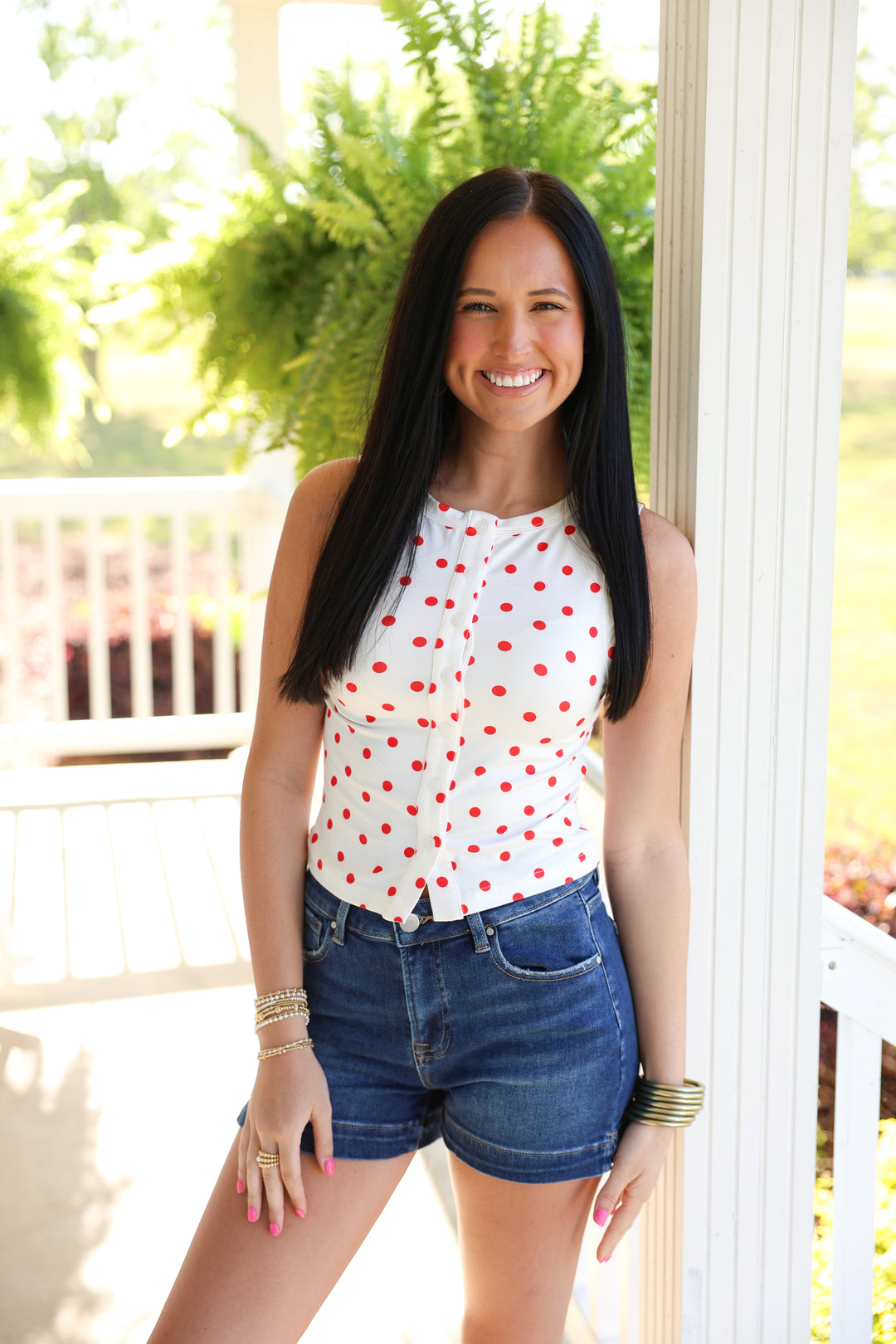 Sleeveless Round Neck Button Down Polka Dot Top "White/Red"