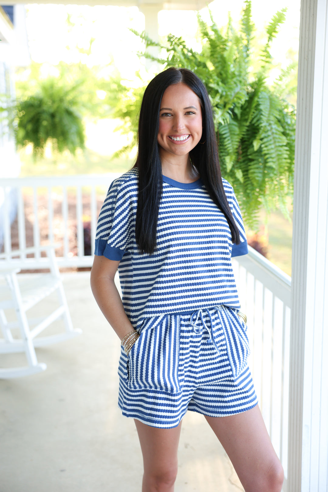 Striped Comfy Knit Top & Short Set "Blue/White"