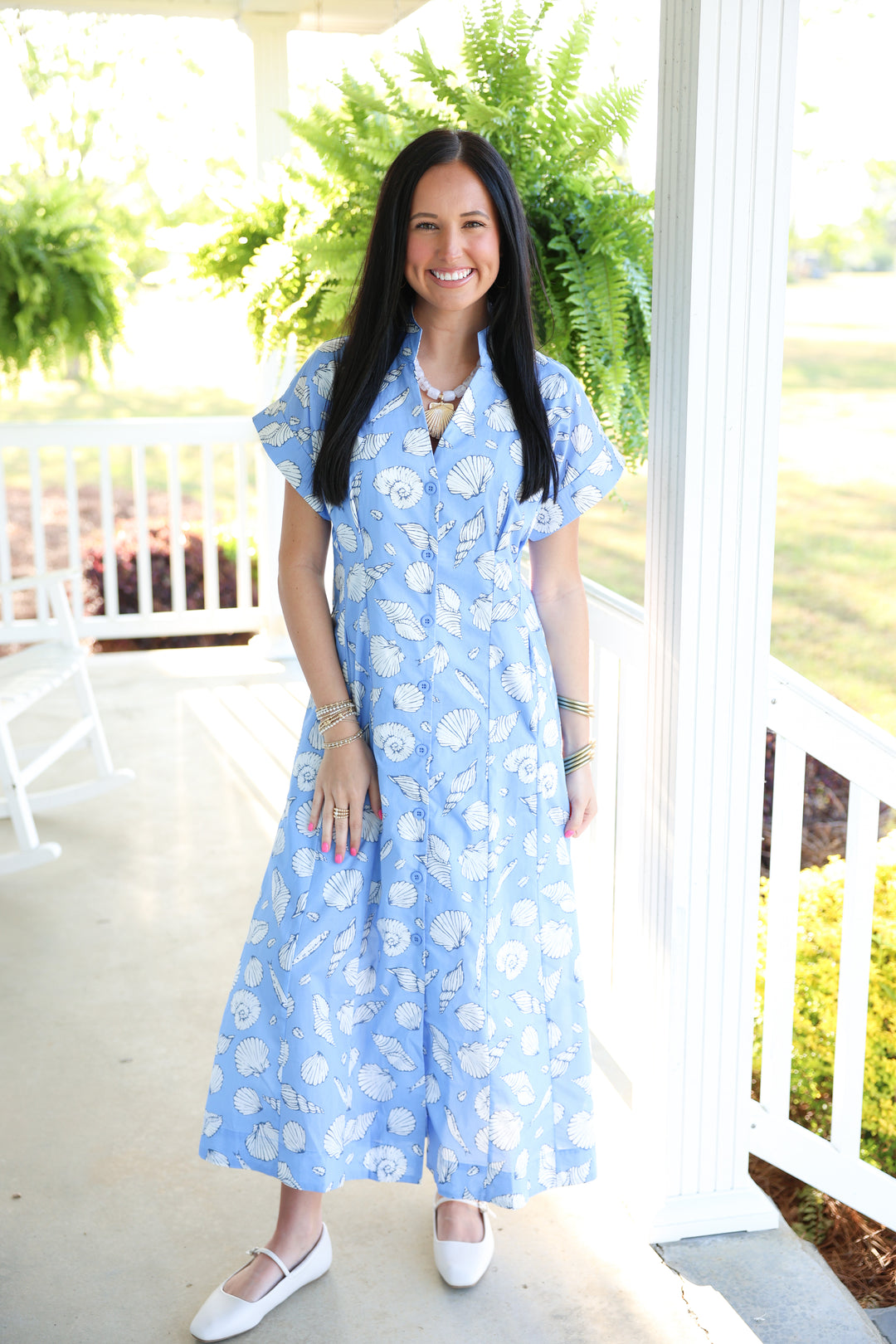 Shell Print Short Sleeve Midi Dress "Blue"