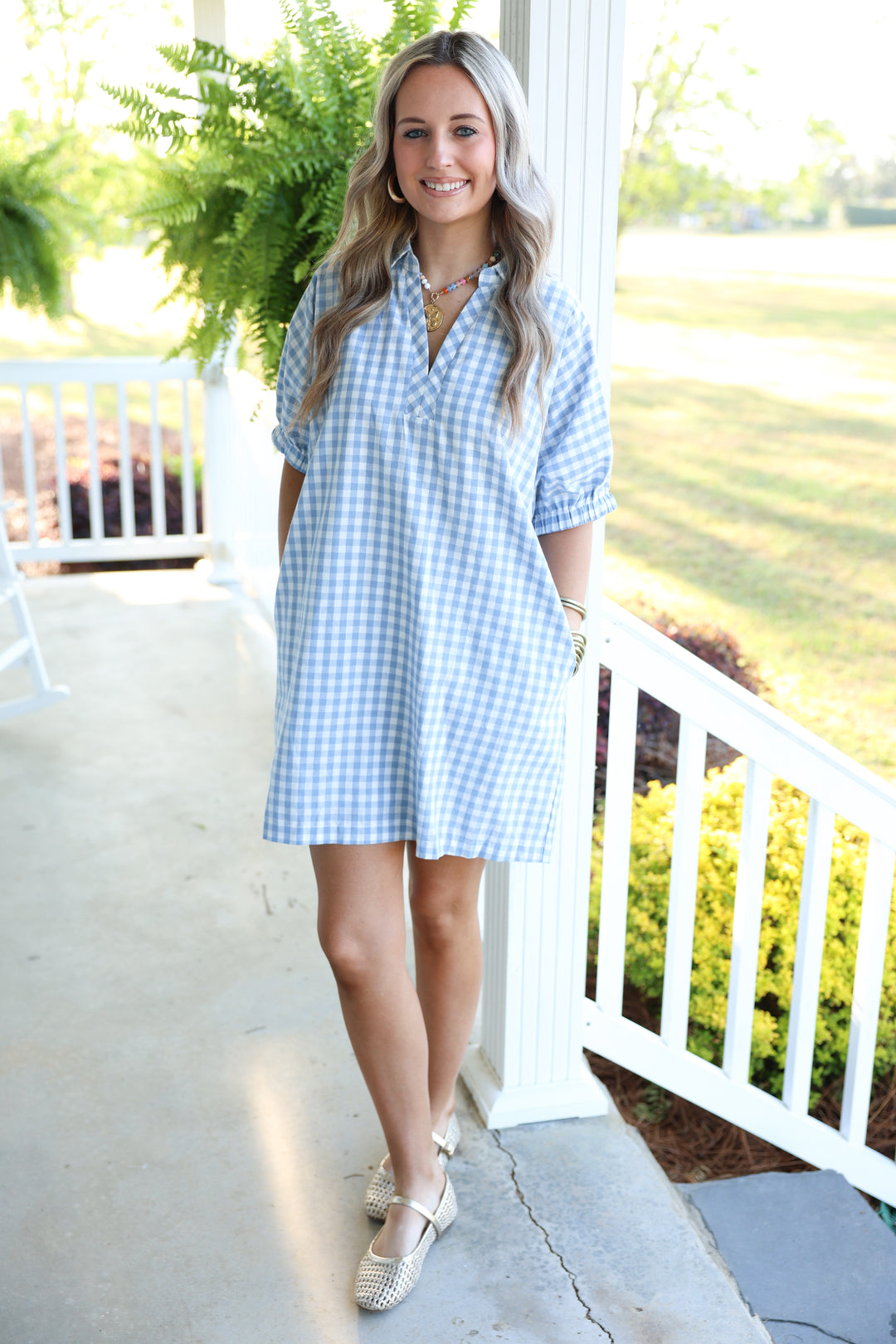 Southern Gingham Print Dress "Blue"