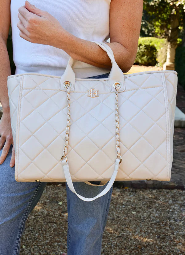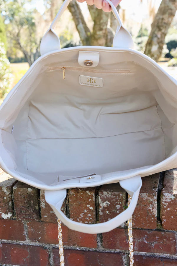 This oversized vegan leather tote is the best go-to handbag! It has two short top handles as well as two elongated braided handles to carry on your shoulder. The Caroline Hill logo is centered at the top of this bag on one side. It has a magnetic closure leading to the roomy interior of the bag. It has one zippered pocket and two open pockets inside. There are also feet on the bottom of the bag for added protection. It's the perfect size for travel, carrying a laptop, or for everyday fashion.