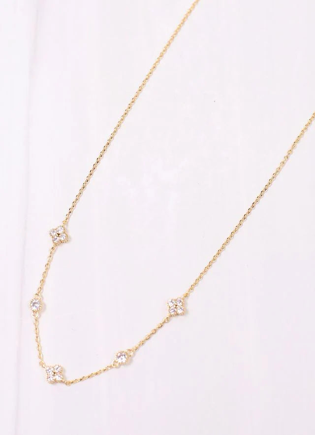 This beautiful, delicate necklace features CZ filled clovers and round CZs as well for just the right amount of sparkle. Made with brass and gold dipped.