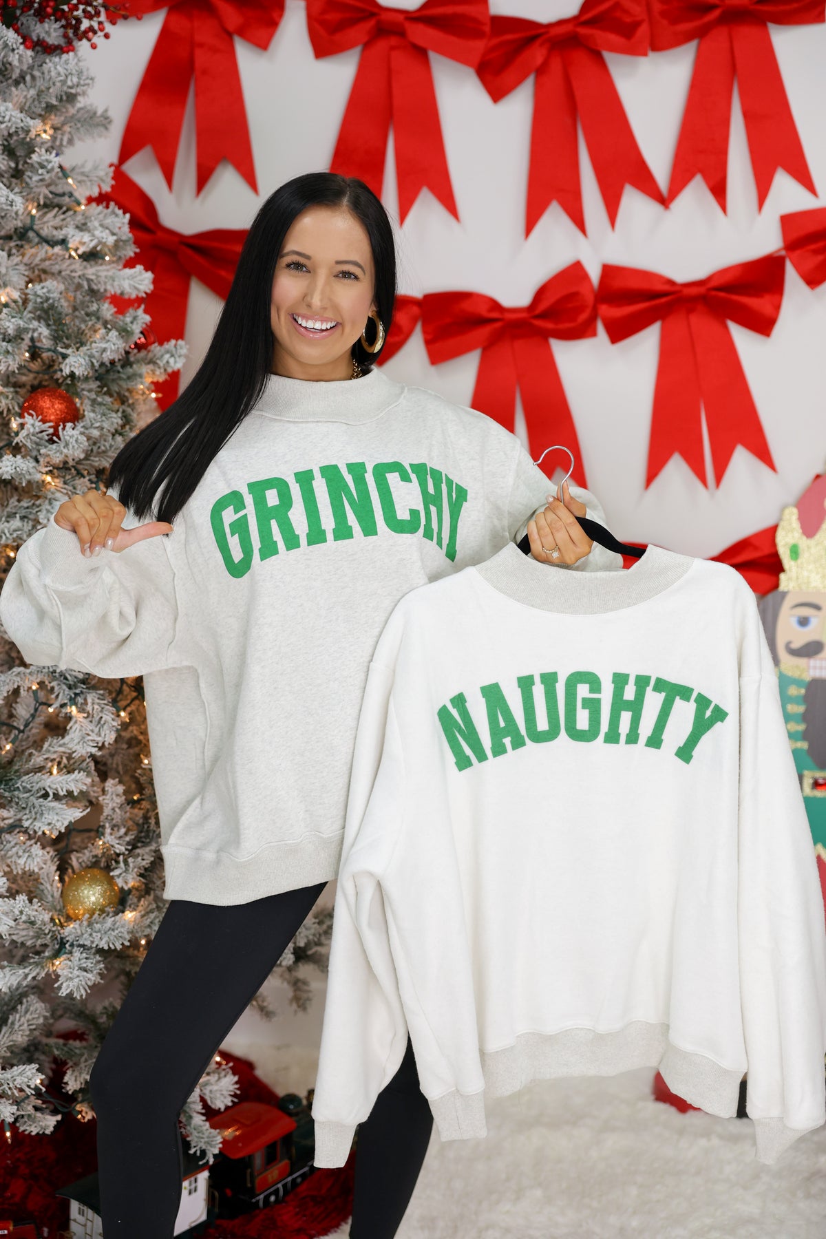 Flip between your inner Grinch and your naughty side with this reversible mock neck sweatshirt! One side features a mischievous "Grinchy" print, while the other showcases bold "Naughty" graphics—giving you two moods in one cozy piece. Perfect for the holiday season or anyone who loves a little playful attitude. The mock neck adds a polished touch, while the soft sweatshirt fabric keeps you comfortable all day long. Switch it up whenever your vibe changes!