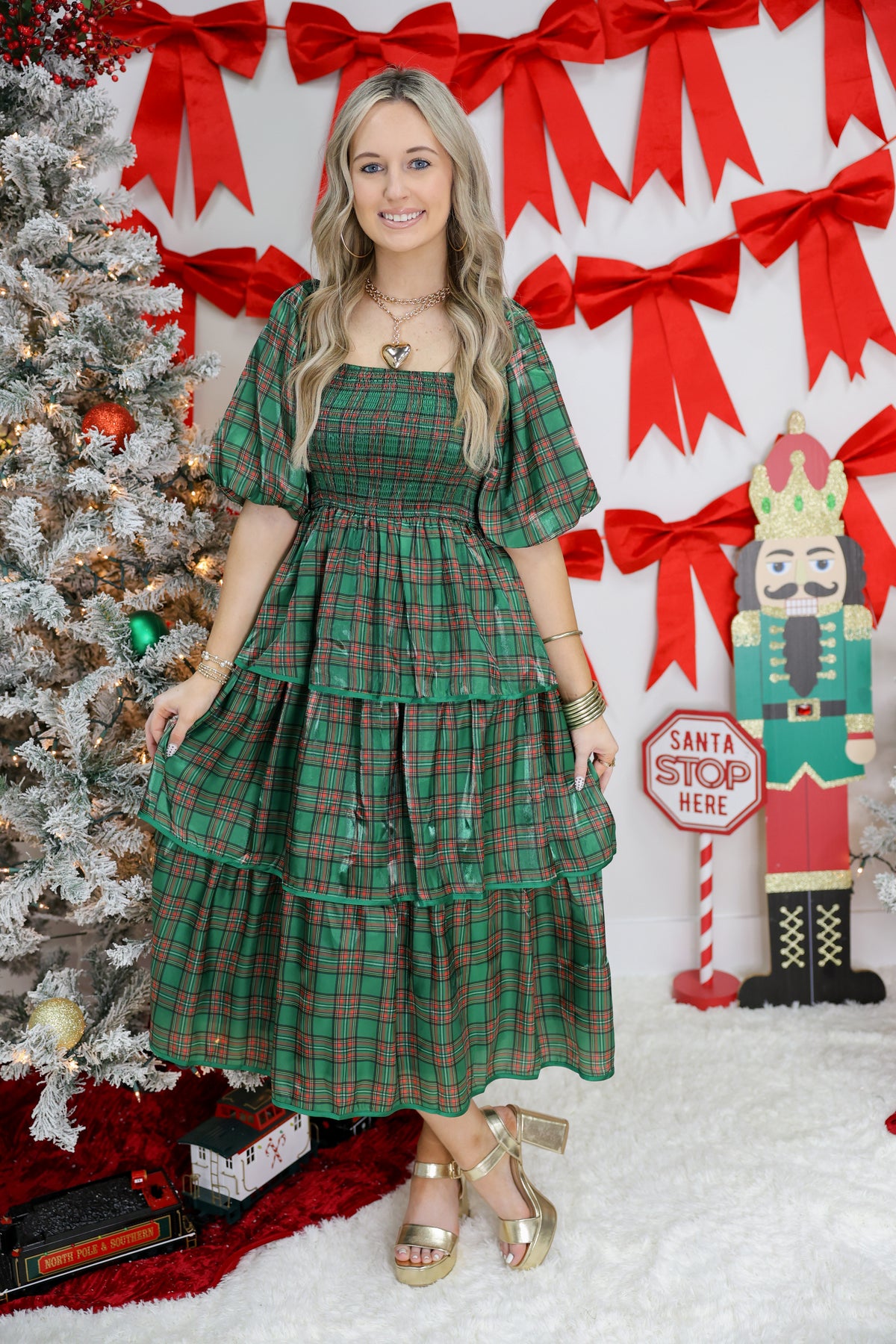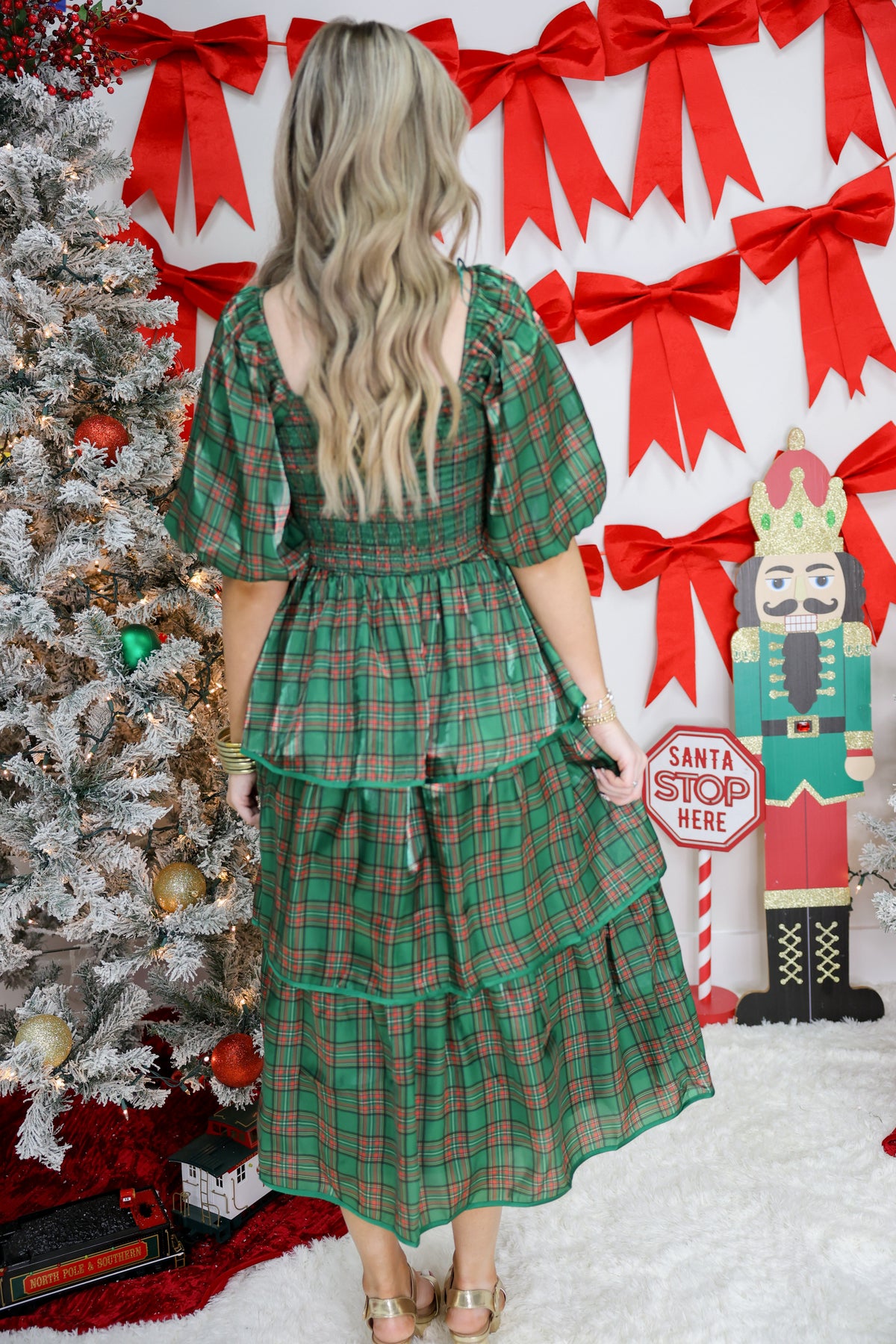 Festive plaid meets fun fashion in this charming midi dress! The hunter green backdrop showcases a classic plaid pattern that's perfect for holiday gatherings and beyond. Puff sleeves add a playful touch of vintage-inspired charm, while the tiered length creates movement and dimension with every step. Whether you're heading to a seasonal celebration or just want to spread some cheer, this dress brings personality and warmth to your wardrobe. A delightful pick for anyone who loves timeless style with a modern twist!