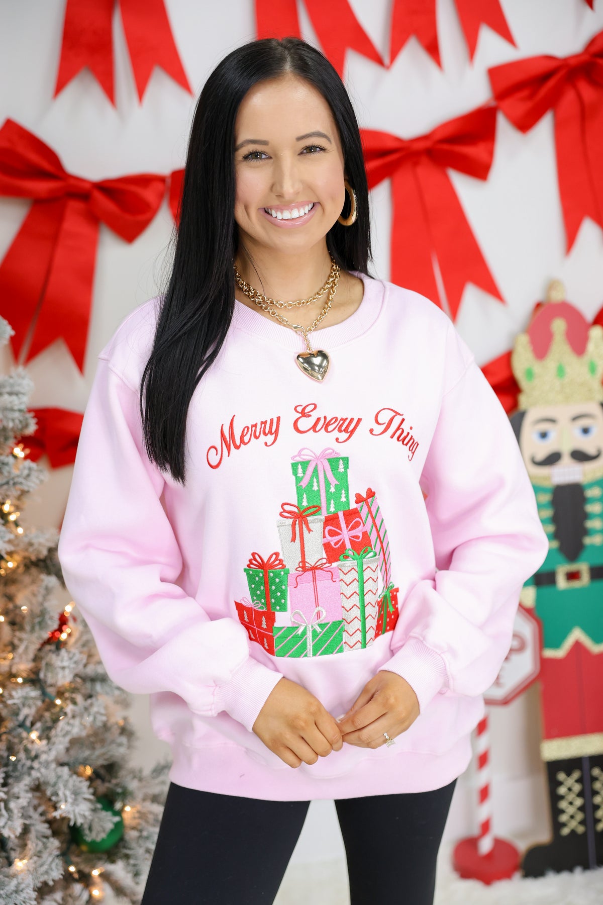 Spread holiday cheer in style with this delightfully festive sweatshirt! Featuring "Merry Every Thing" in shimmering metallic embroidery, it's the perfect blend of cozy comfort and sparkly sophistication. The soft light pink fabric provides a gentle, flattering backdrop for the eye-catching embroidered detail that catches the light beautifully. Whether you're heading to a holiday gathering or keeping things casual, this sweatshirt brings instant festive flair to your wardrobe. Cuddle up in comfort while making a cheerful statement!