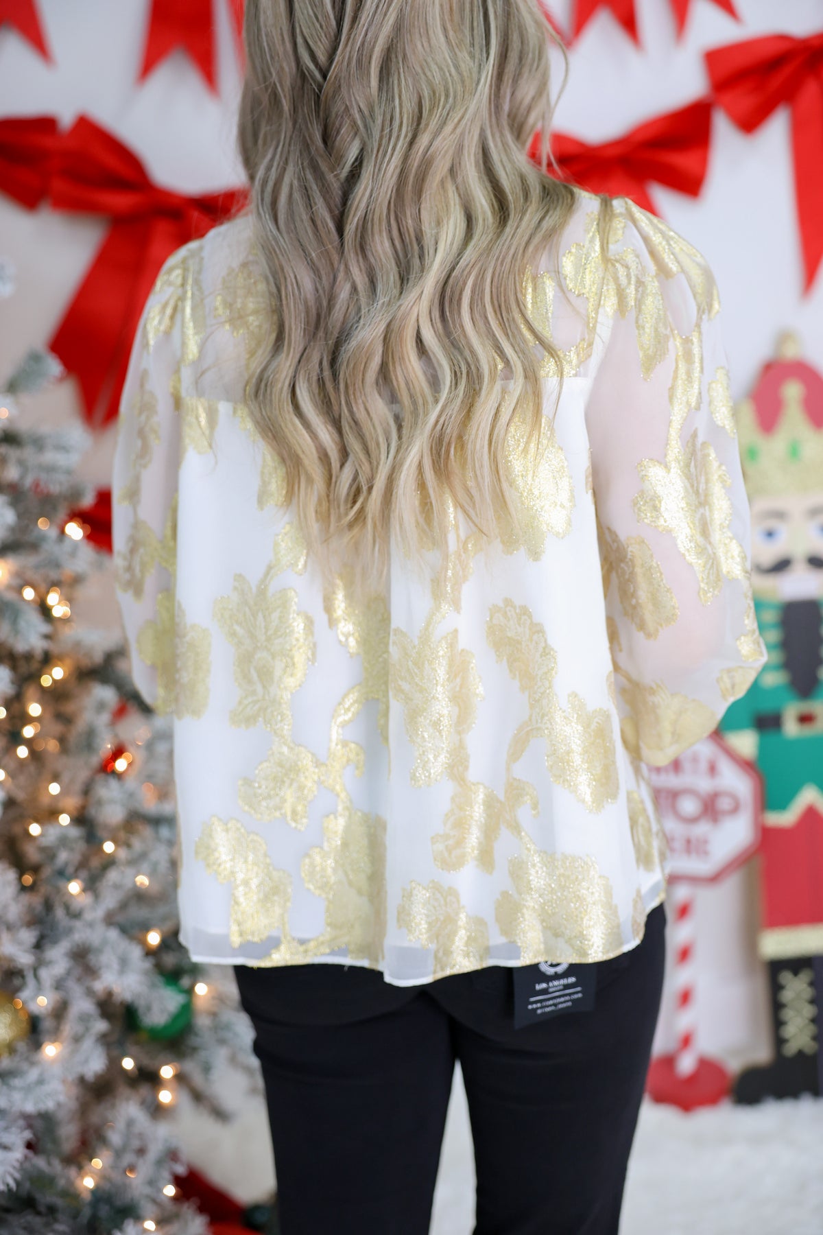 Elevate your everyday style with this stunning metallic jacquard chiffon blouse featuring an elegant bow detail. The luxe fabric shimmers with cream and gold tones, creating an eye-catching look that transitions seamlessly from office to evening. The charming bow adds a touch of feminine flair and playful sophistication. Perfect for dressing up basics or layering over your favorite pieces, this blouse is a versatile wardrobe essential that brings instant glamour to any outfit.