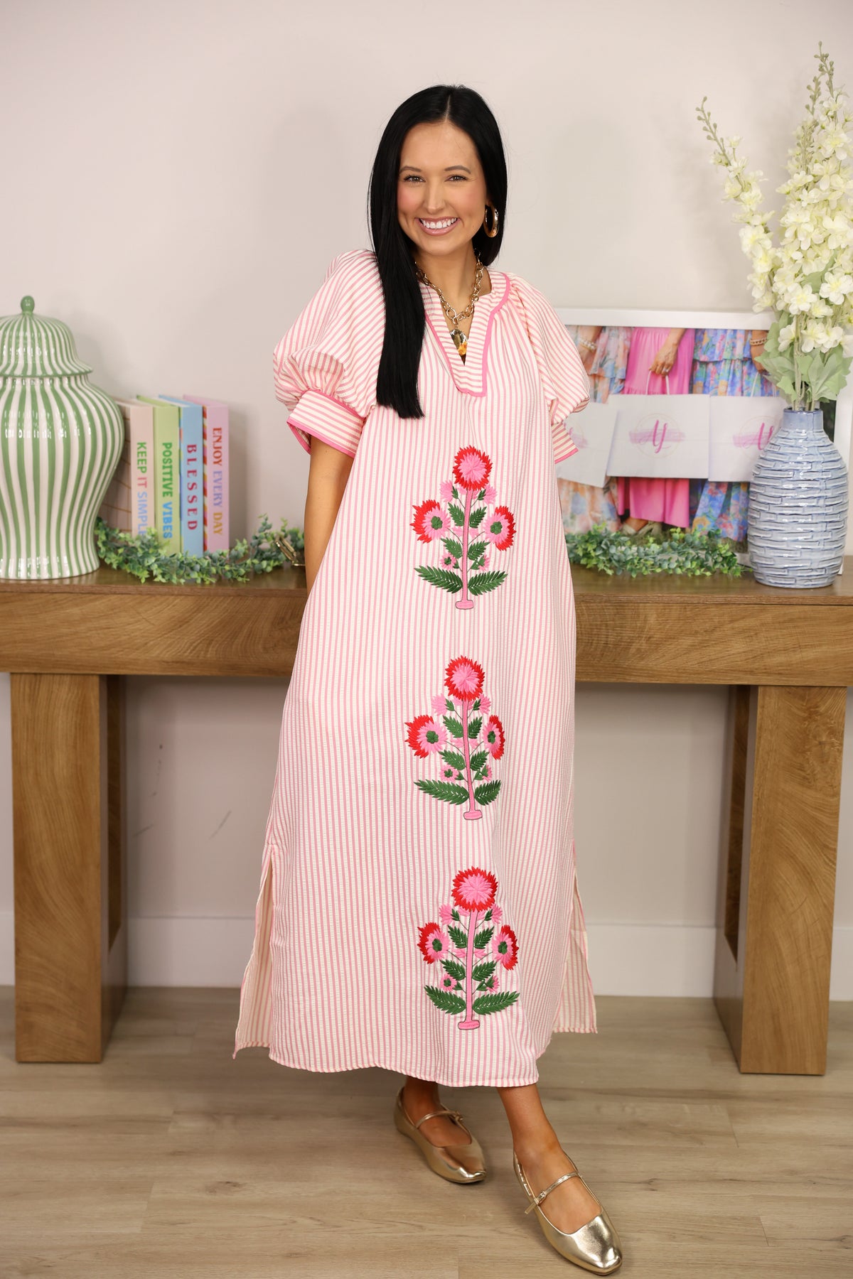 Strut your stuff in this charming striped dress, where classic lines meet delicate floral embroidery for an effortlessly chic vibe. The playful pink palette brings a fresh, breezy feel perfect for weekend adventures or casual outings. Soft, comfortable fabric keeps you looking polished without sacrificing ease of movement. Whether you're heading to brunch or exploring the neighborhood, this dress strikes the perfect balance between put-together and relaxed. A wardrobe essential that works as hard as you do.