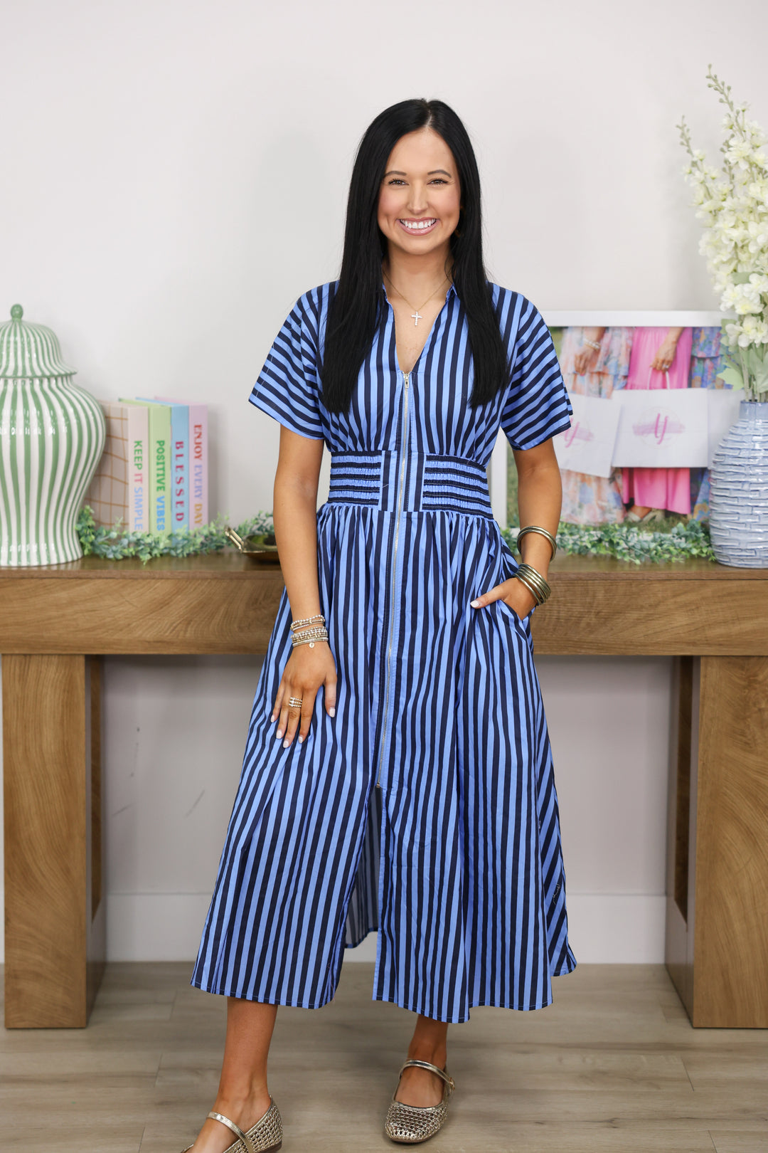 Gracious Stripes Zipper Midi Dress "Navy"
