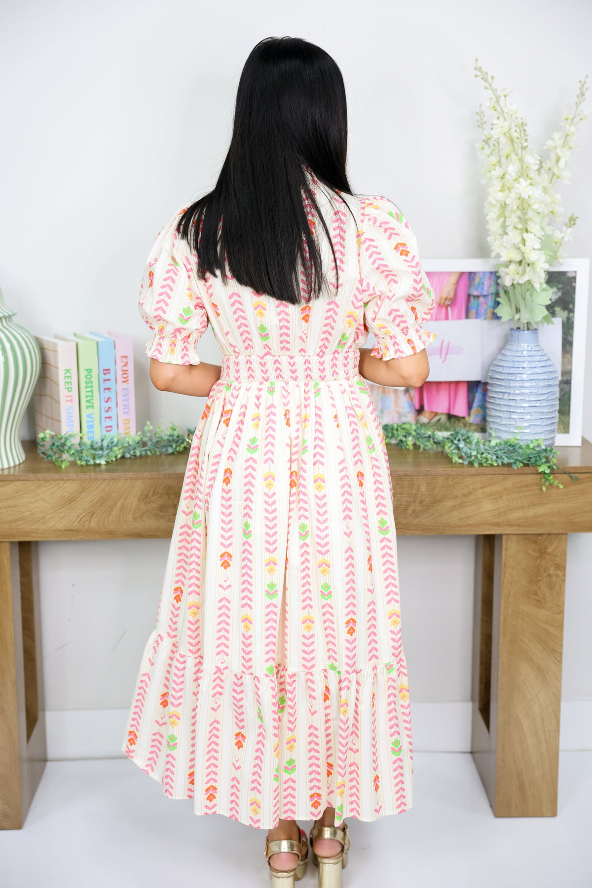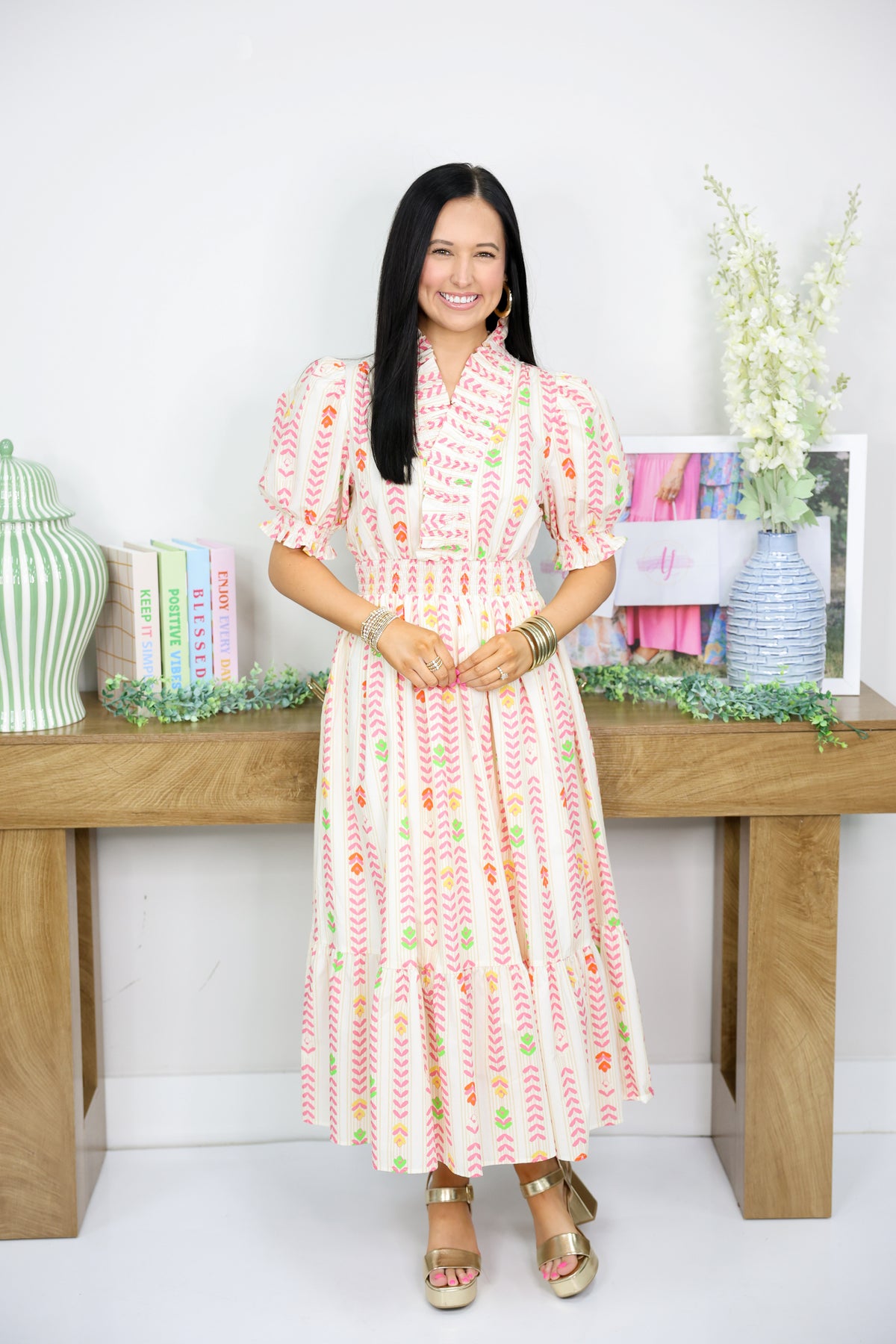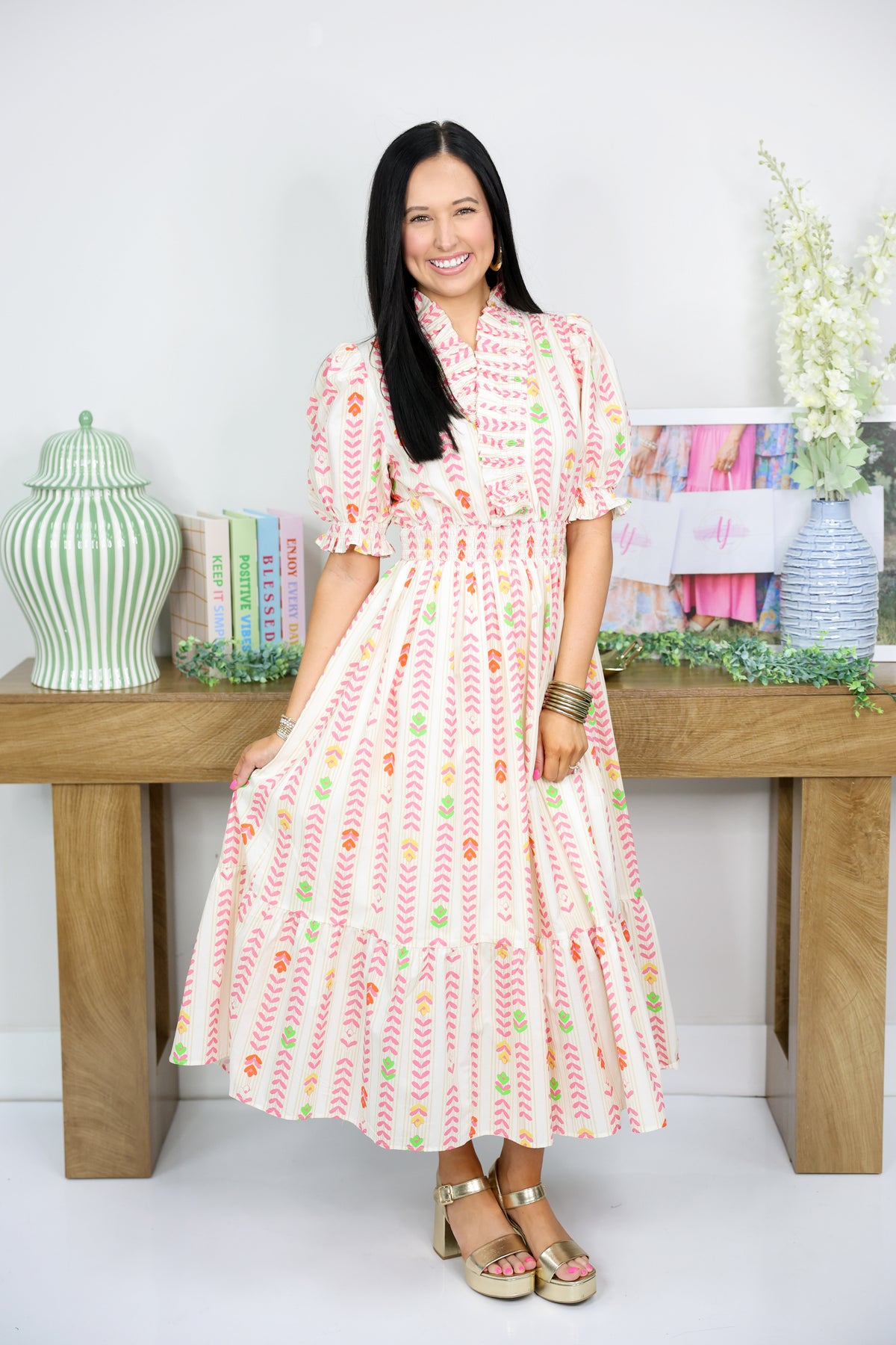 Twirl into a rainbow moment with this vibrant midi dress that celebrates color in the most joyful way. The cream mix palette blends soft and bold hues for a look that's equal parts fun and flattering. Perfect for brunch dates, garden parties, or whenever you want to brighten the room. The midi length hits just right—sophisticated yet playful. Dress it up with heels or keep it casual with sneakers; this versatile piece adapts to your vibe.