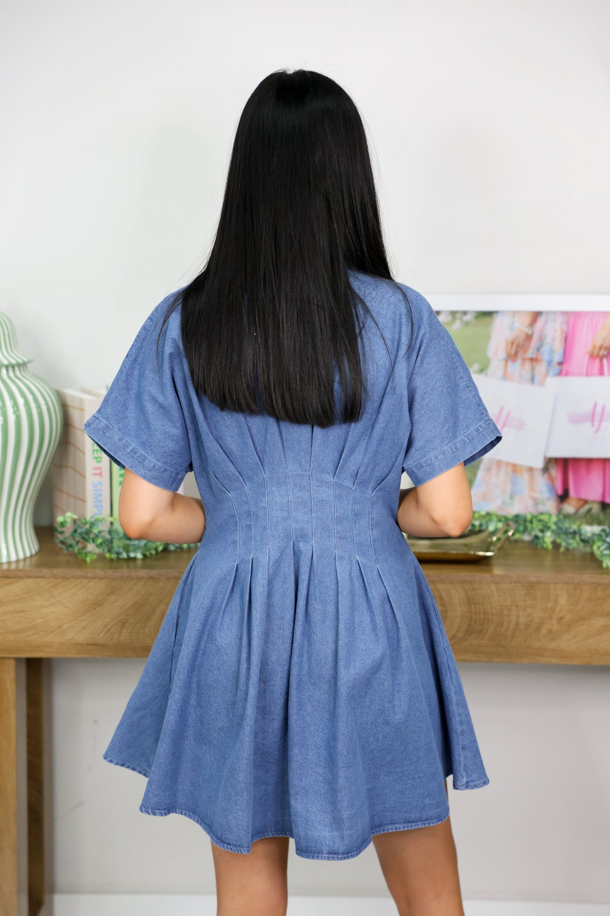 Pleated Button Down Denim Mini Dress