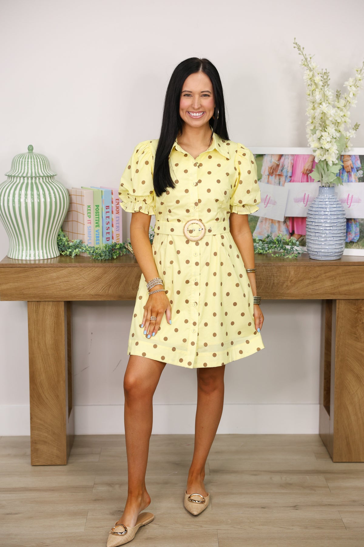Brighten your wardrobe with this charming polka dot mini dress in cheerful lemon yellow. The short puff sleeves add a playful, feminine touch, while the defined belt detail cinches the waist for a flattering silhouette. Perfect for casual outings, brunch dates, or weekend adventures, this dress combines vintage-inspired style with modern comfort. A versatile piece that transitions effortlessly from day to night.