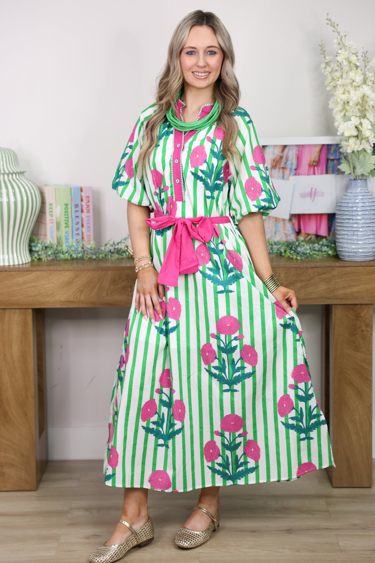 Twirl into spring with this charming midi dress featuring a vibrant green and pink printed design. The flowing silhouette hits just right at the knee, making it perfect for brunch dates, garden parties, or casual weekend adventures. The playful color mix brings instant joy to your wardrobe while the midi length keeps things effortlessly elegant. Dress it up with heels or down with sneakers—this versatile piece is ready for whatever your day brings.