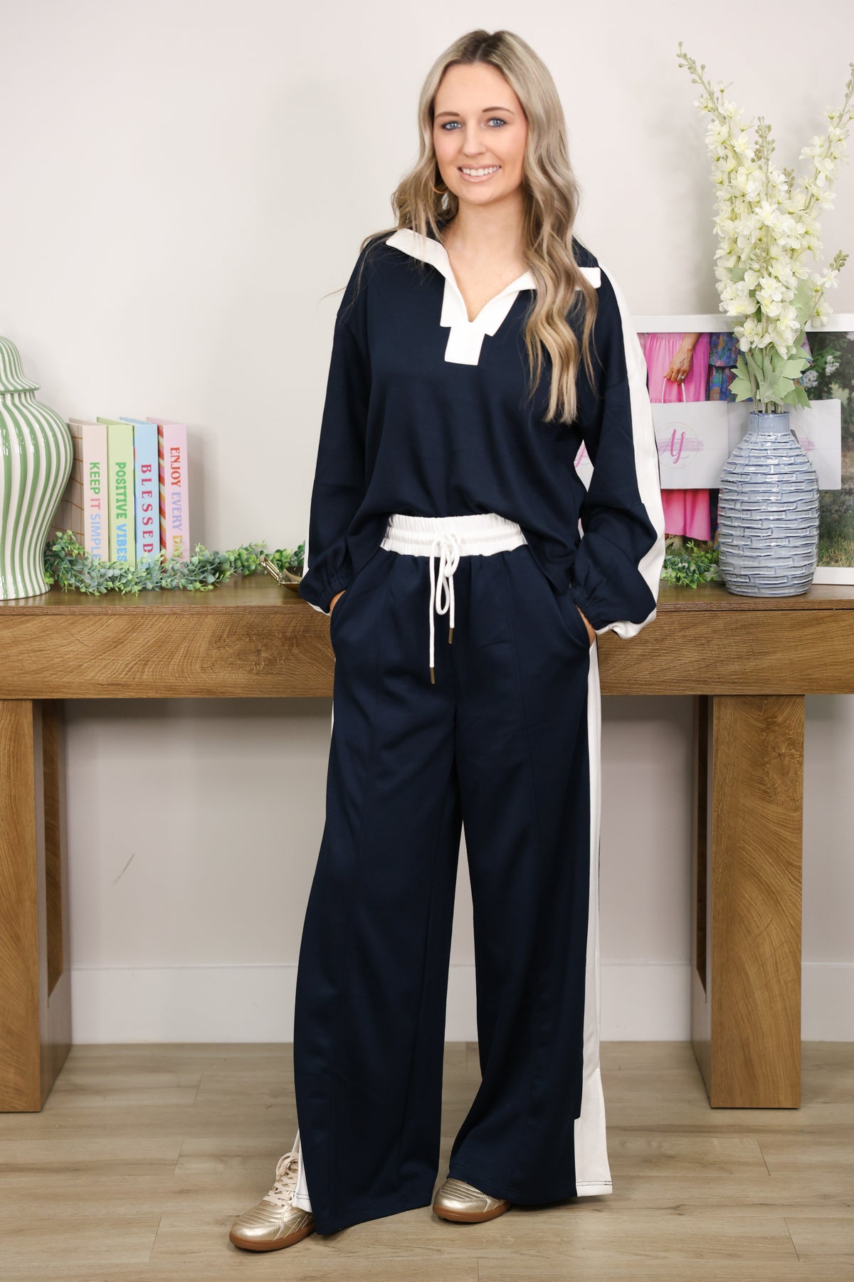 Meet the Nellie Navy Trim Set—your new go-to for effortless style! This charming two-piece features a cozy long sleeve top paired with matching pants, both accented with crisp navy trim that adds just the right pop of polish. Perfect for lounging at home or running errands in comfort, this set keeps you looking put-together without trying too hard. Mix, match, or wear together—either way, you'll love how easy it is to feel cute and comfortable all day long!