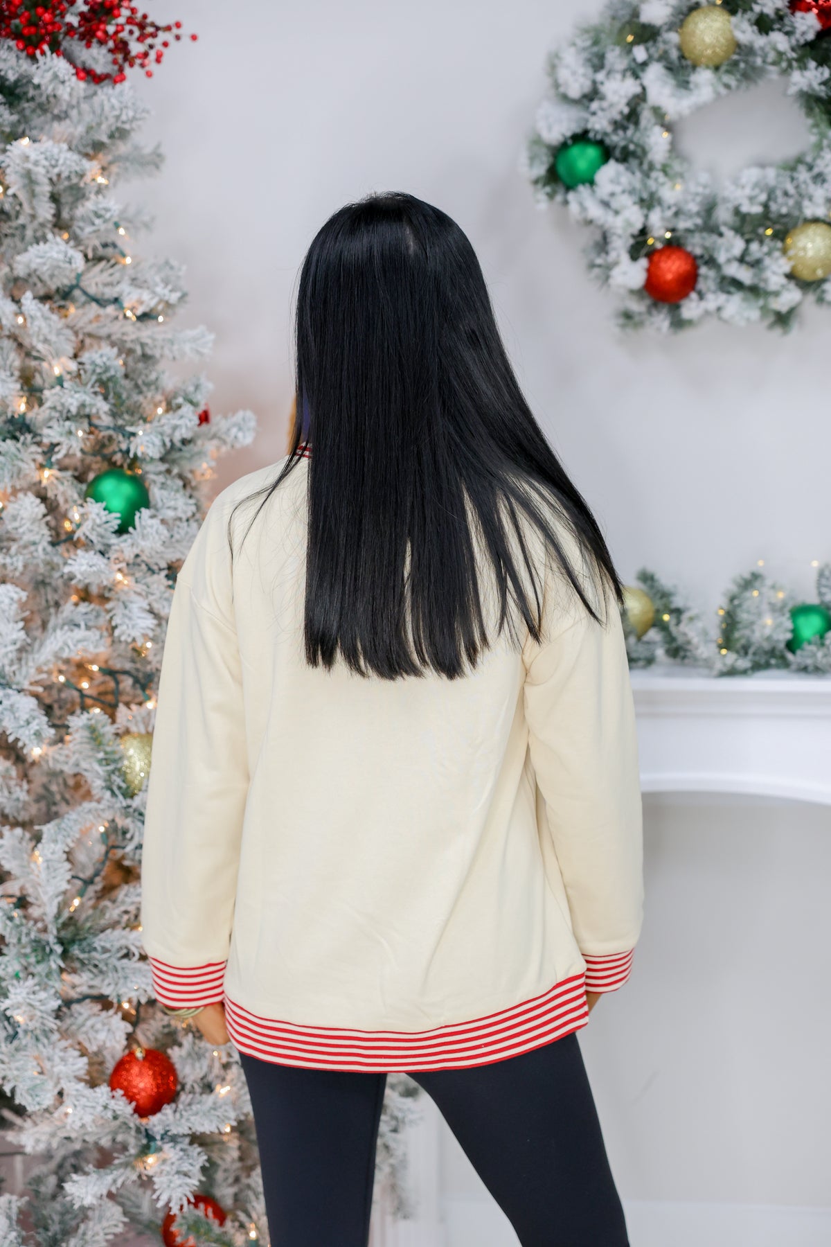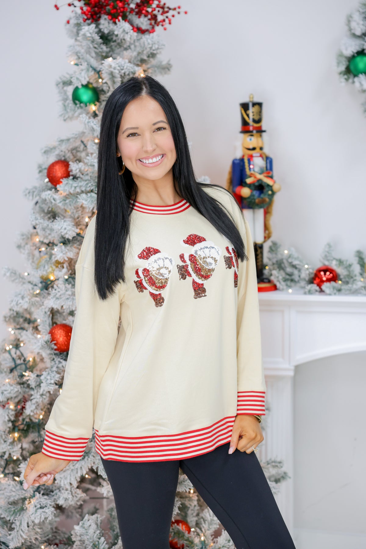 Get ready to sleigh the holiday season in this festive Skating Santa Trio Top! Featuring shimmering sequins that catch the light with every move, this playful sweatshirt brings major Christmas cheer to your wardrobe. The charming sand-colored base lets those sparkly Santas take center stage as they glide across the front. Perfect for holiday parties, casual gatherings, or anyone who loves spreading seasonal joy with a touch of shimmer and sass.