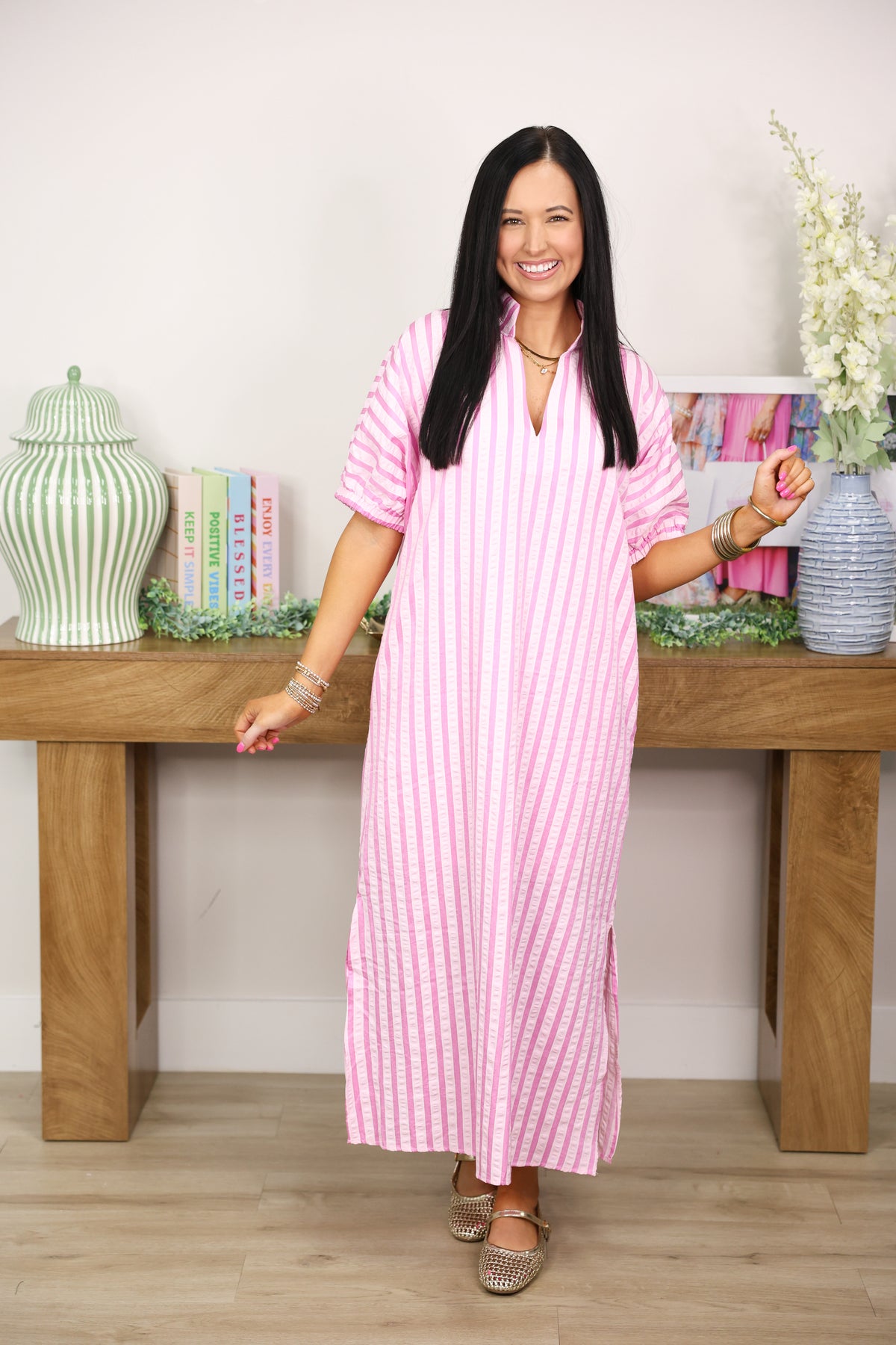 Twirl into spring in this charming midi dress that hits all the right notes! The flattering V-neckline frames your face beautifully while the playful stripe and textured fabric combo adds visual interest and dimension. Perfect for brunch dates, garden parties, or whenever you want to feel effortlessly put-together in pink perfection.