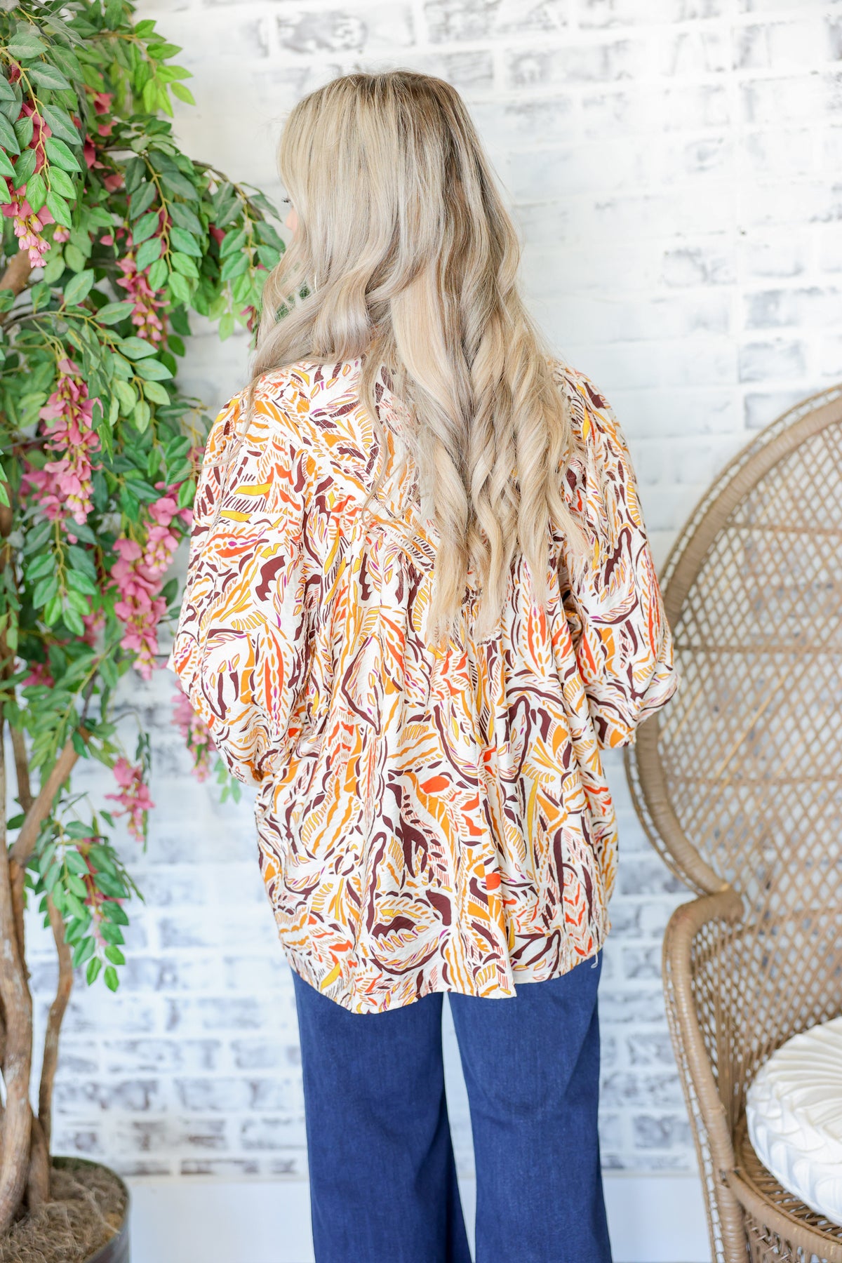 Printed Button Down Long Sleeve Top "Apricot Brown"