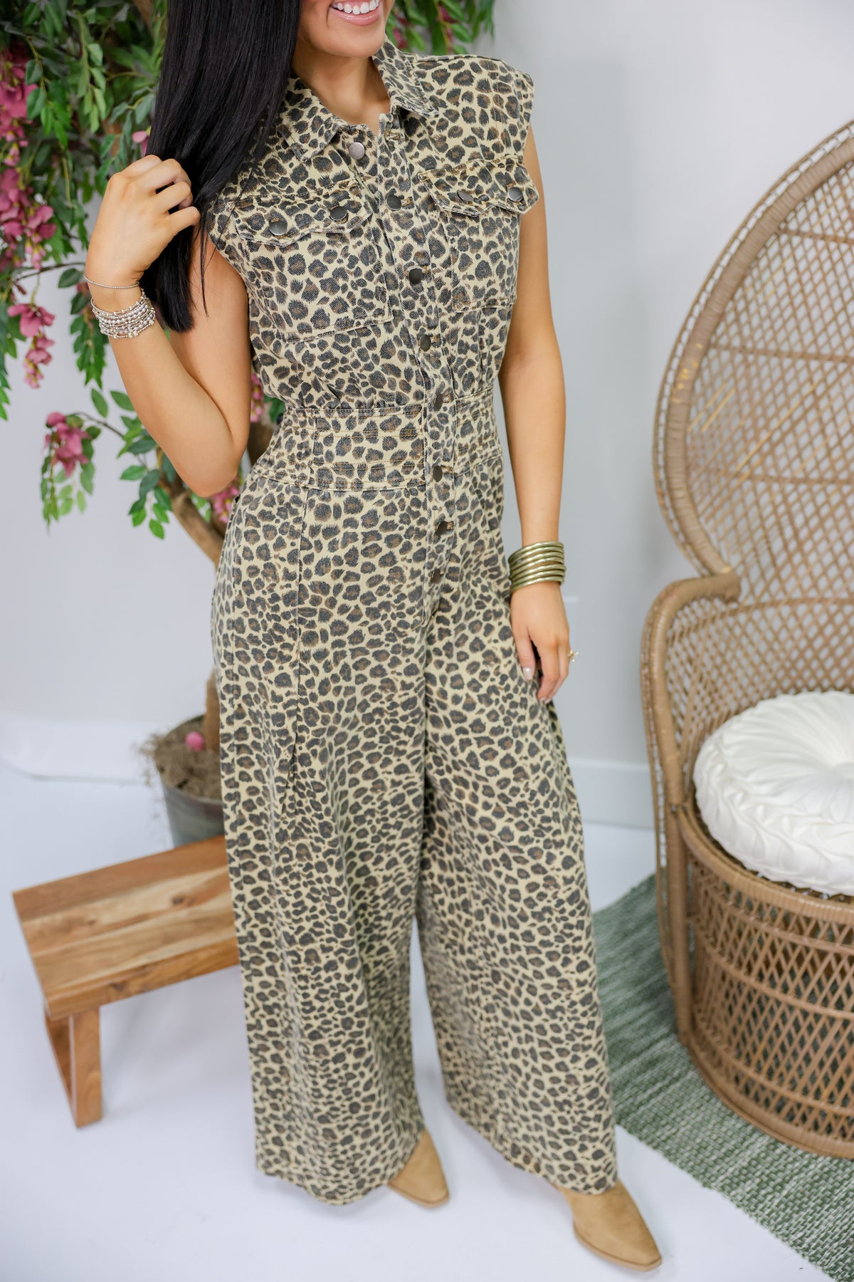 Turn heads in this playful Leopard Sleeveless Jumpsuit featuring chic button details down the front. Its sleeveless cut keeps you cool and stylish, while the bold leopard print adds a fierce touch to your look. Perfect for fun outings or casual days when you want to stand out effortlessly.