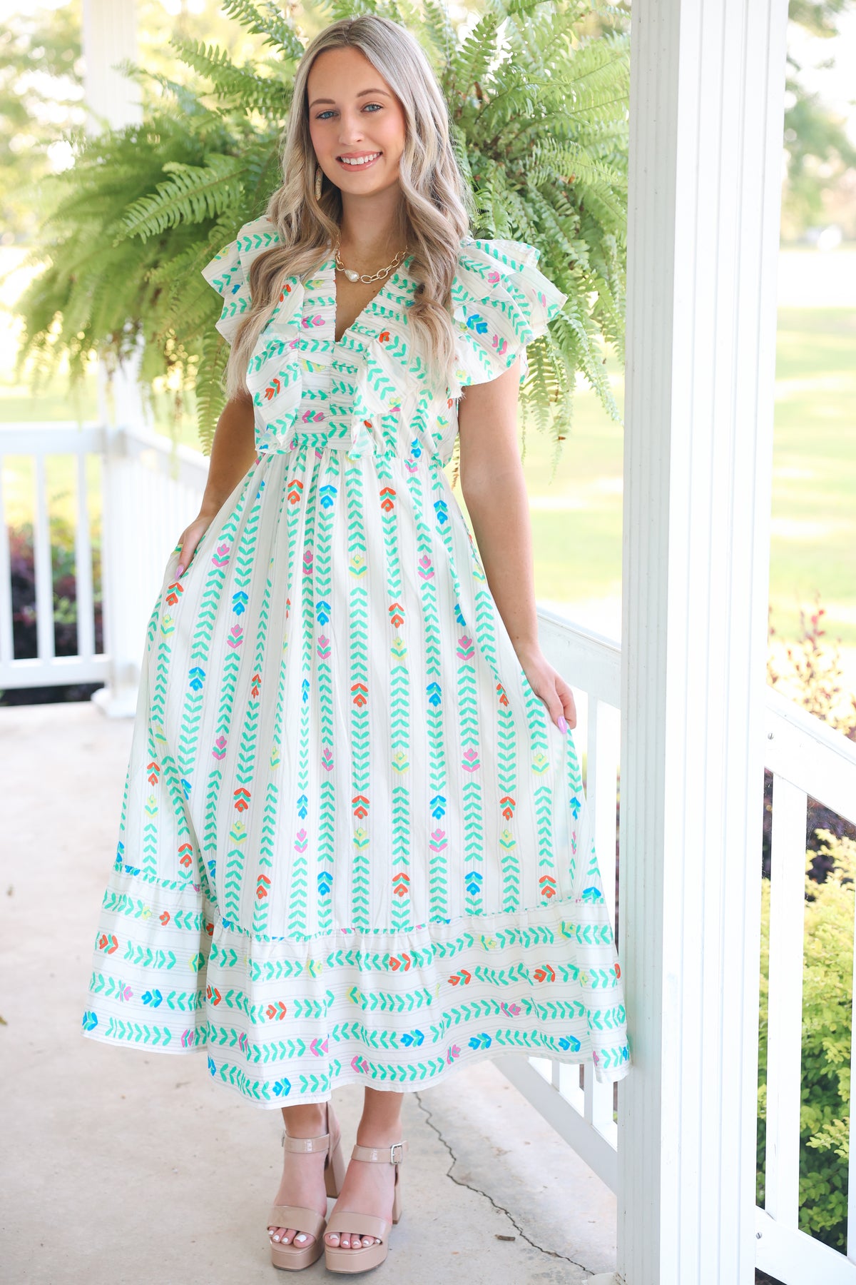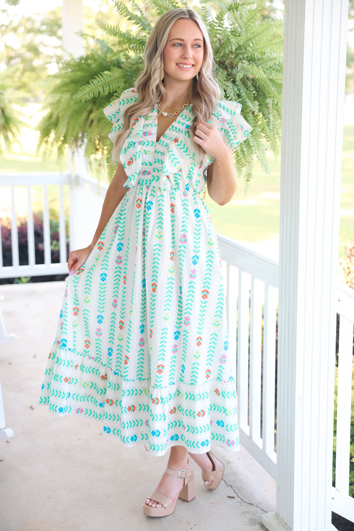 The Color Spectrum Dress in Off White features a charming ruffle V-neckline and playful ruffle sleeves that add a flirty touch to your look. Perfect for sunny days or casual outings, this dress combines comfort with a fun, feminine flair.