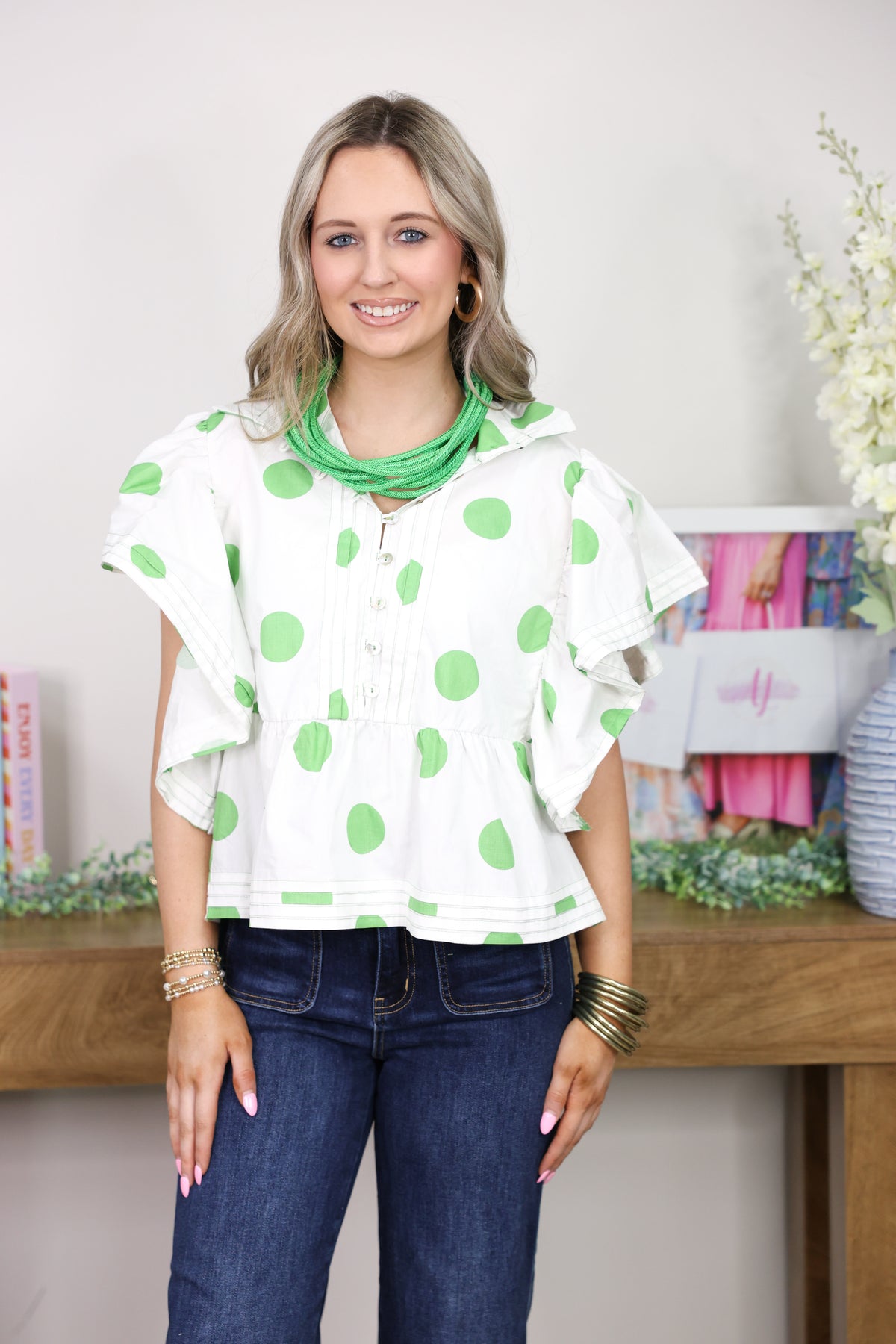 Twirl into spring with this charming ruffle blouse featuring a delightful green and white polka dot pattern. The playful ruffled details add movement and personality to your wardrobe, making it perfect for casual outings or dressing up with your favorite skirt. Lightweight and versatile, this top pairs effortlessly with jeans, shorts, or layered pieces for endless styling possibilities. A fun, feminine staple that brings instant joy to any outfit.