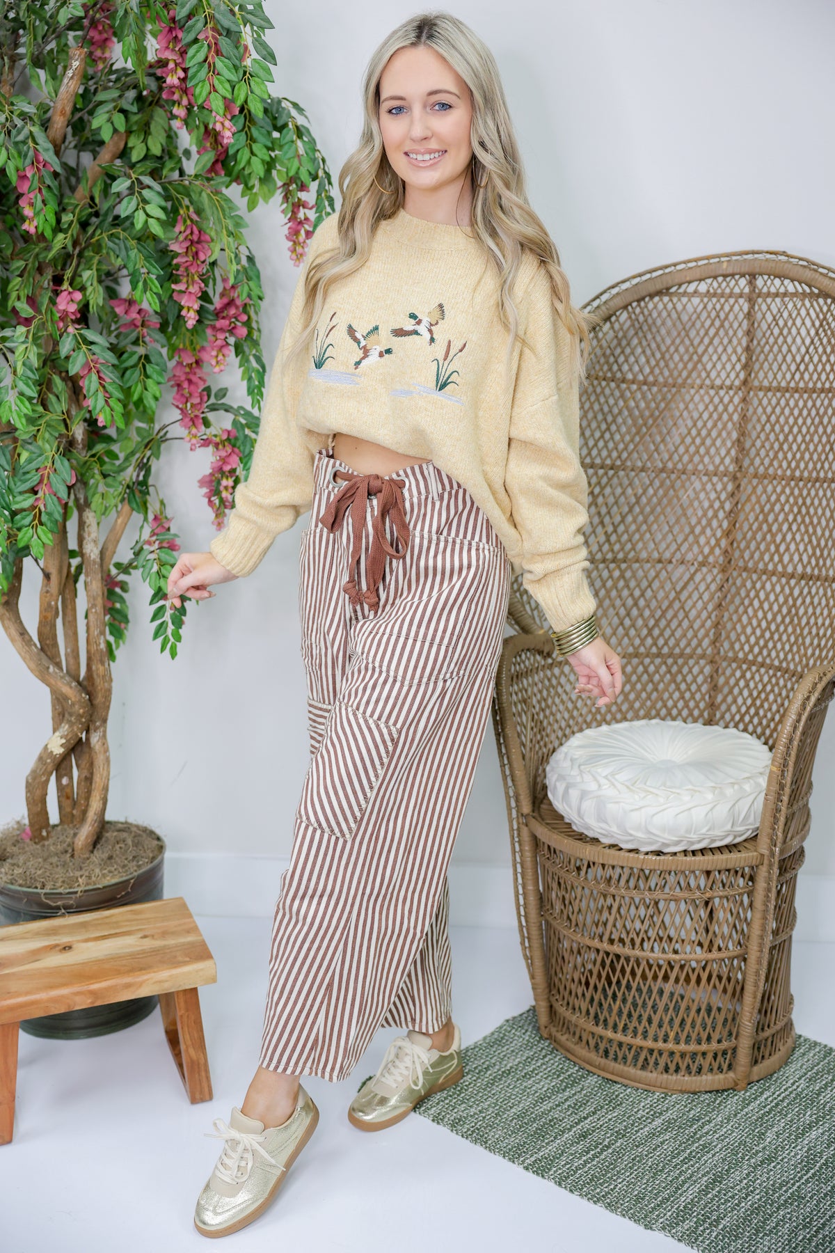 Stay cozy and stylish with the Flying Mallards Knit Sweater in Butter. This playful knit features charming mallard motifs that add a whimsical touch to your wardrobe. Perfect for crisp mornings or cozy nights in, its soft fabric keeps you comfy while turning heads. Add a bit of bird-brained fun to your outfit and let your style take flight!
