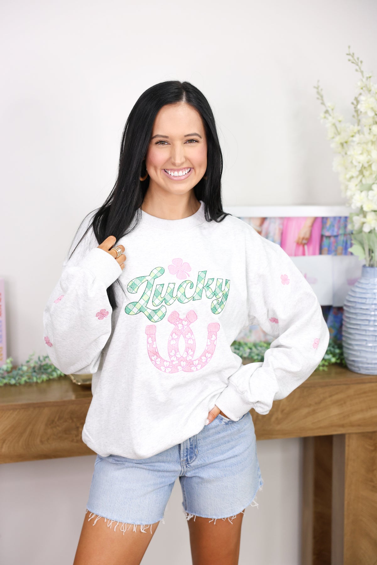 Feeling lucky? This cozy sweatshirt features a charming clover stitch embroidery that brings a touch of whimsy to your everyday wardrobe. Crafted in soft heather grey, it's the perfect layering piece for casual days when you want comfort without compromising on style. Whether you're chasing good vibes or just love a little botanical charm, this sweatshirt delivers both warmth and personality in one delightful package.