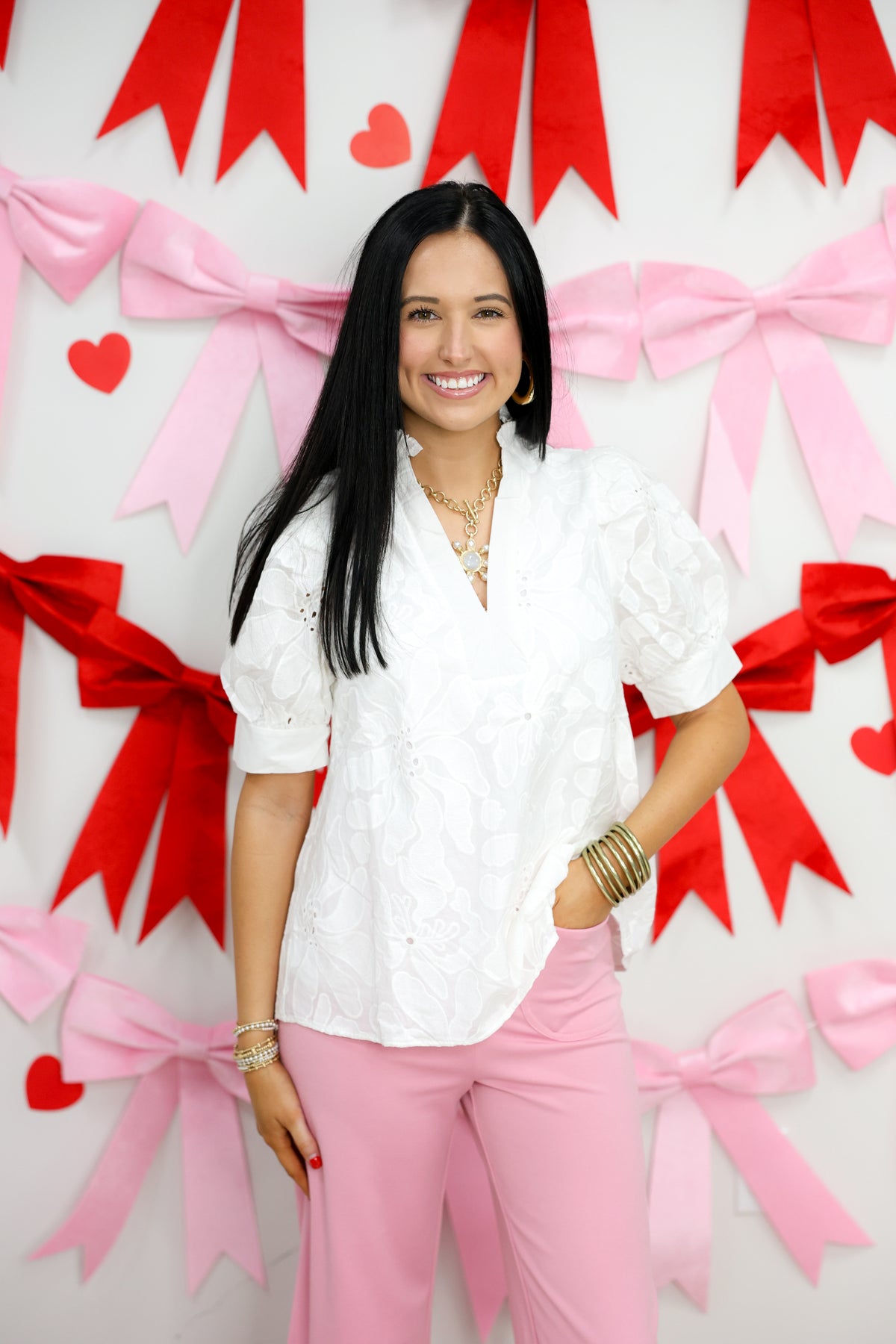 The Darling Top is your new go-to for effortless charm. This crisp white short-sleeve beauty features intricate detailing that adds just the right amount of personality to any outfit. Perfect for layering or wearing solo, it's the kind of piece that makes getting dressed feel like fun. Dress it up with tailored trousers or keep it casual with your favorite jeans—either way, you'll look absolutely darling.