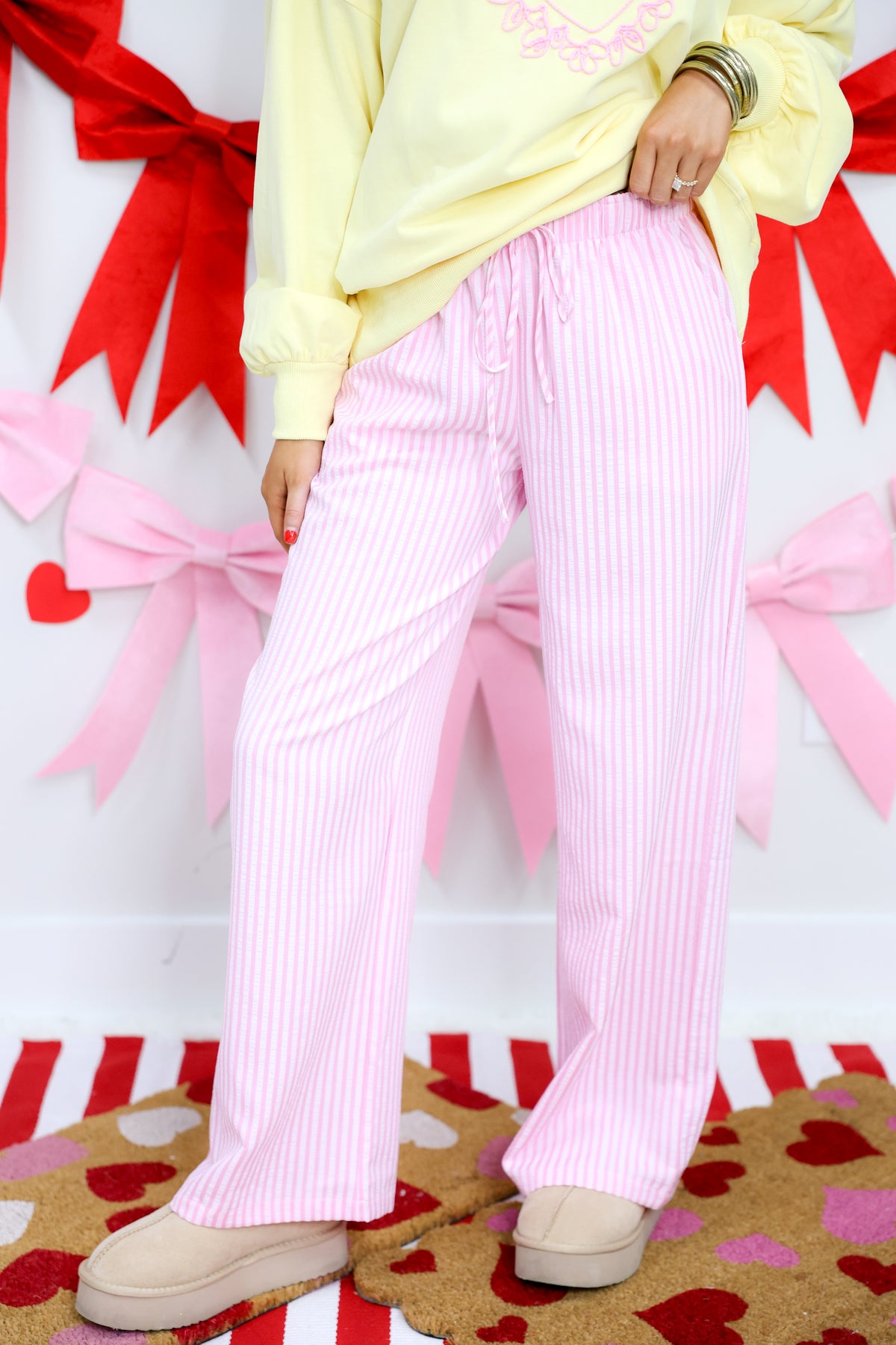 Stripes never go out of style, and these long pants prove it! Featuring a charming waist tie detail that adds personality and adjustability, they're perfect for mixing into your everyday rotation. The classic striped pattern works with practically everything in your closet, while the pink hue brings a fun, fresh vibe. Comfortable enough for all-day wear, these pants are your new go-to for effortless style.