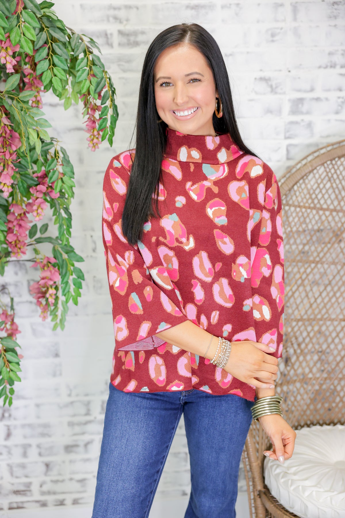 Roar into fall with this stunning leopard mock neck sweater! The bold animal print brings serious style points, while the bell sleeves add a flirty, fashion-forward touch. Crafted in a rich wine multi colorway, it's the perfect piece to elevate your everyday look with a dash of wild confidence. Layer it, style it, own it—this sweater is ready for anything your week throws at you.