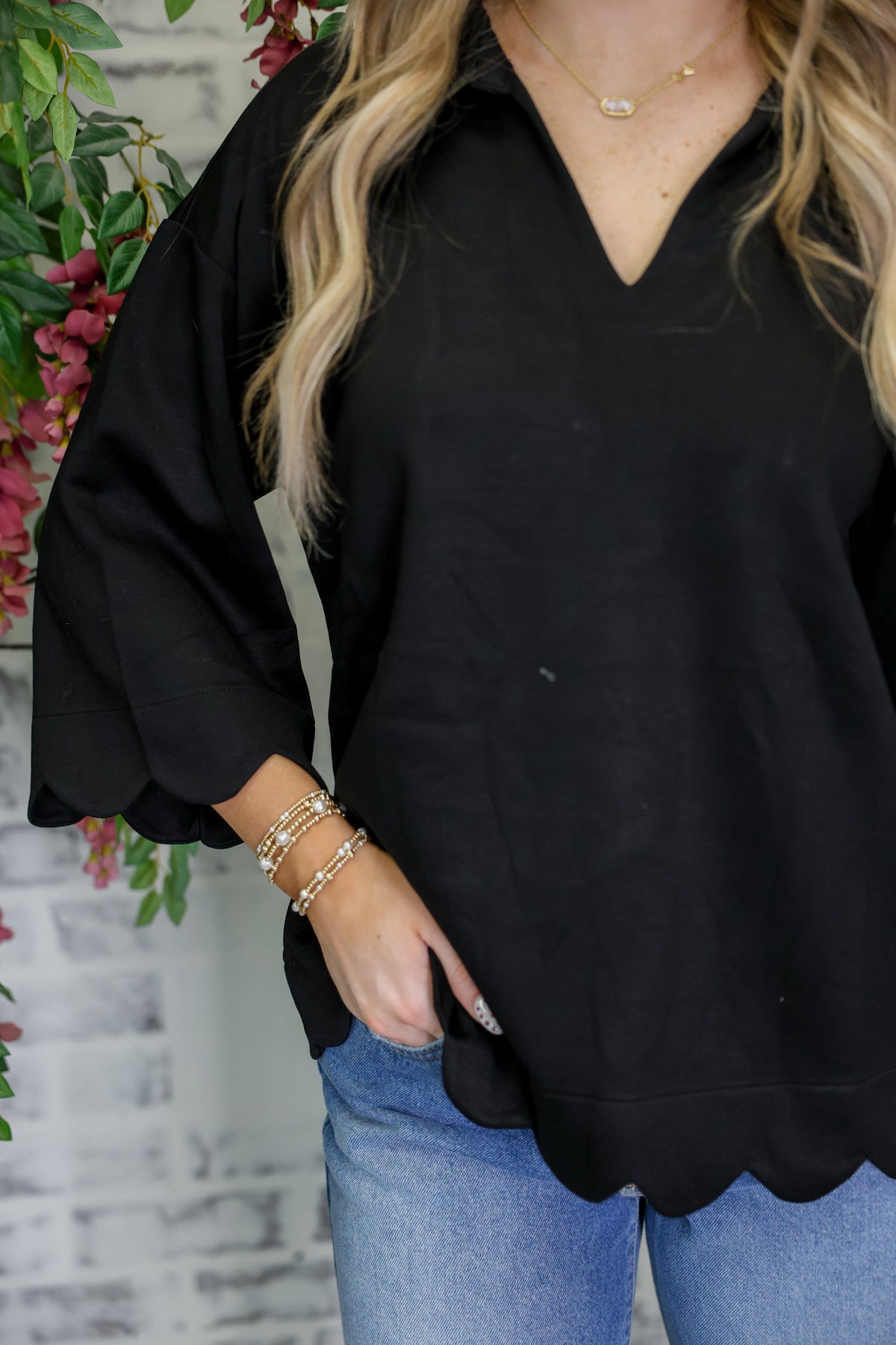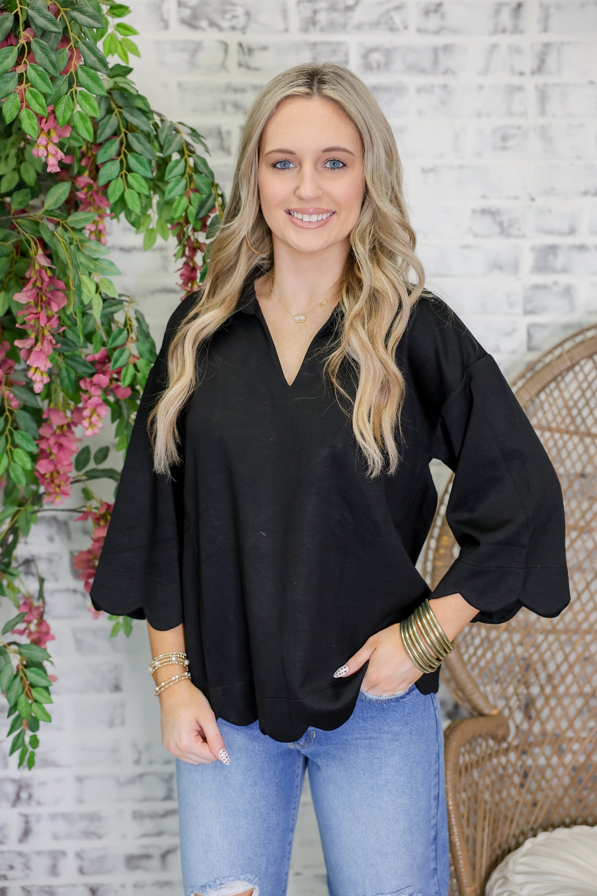 Slip into pure comfort with this butter soft scallop edge top in a dreamy black mousse shade. The delicate scalloped neckline adds a touch of feminine charm, while the luxuriously soft fabric feels like a gentle hug against your skin. Perfect for layering or wearing solo, this versatile piece transitions effortlessly from casual coffee dates to cozy evenings. A wardrobe essential that's as soft as it sounds!