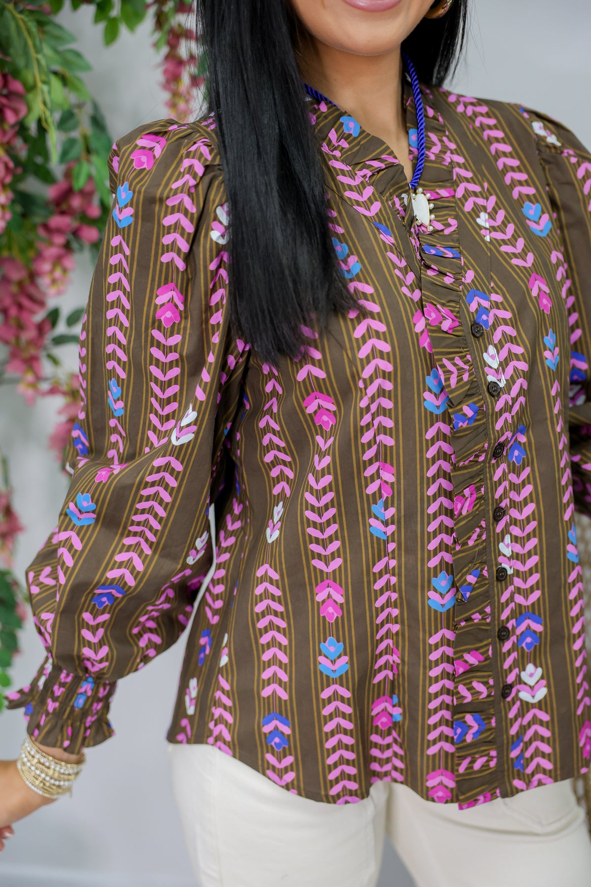 Embrace a playful splash of style with the Color Spectrum Top "Brown." This long sleeve top features charming ruffled details that add a flirty, feminine touch to your look. Perfect for layering or wearing solo, its vibrant design makes every outfit pop with personality and fun.
