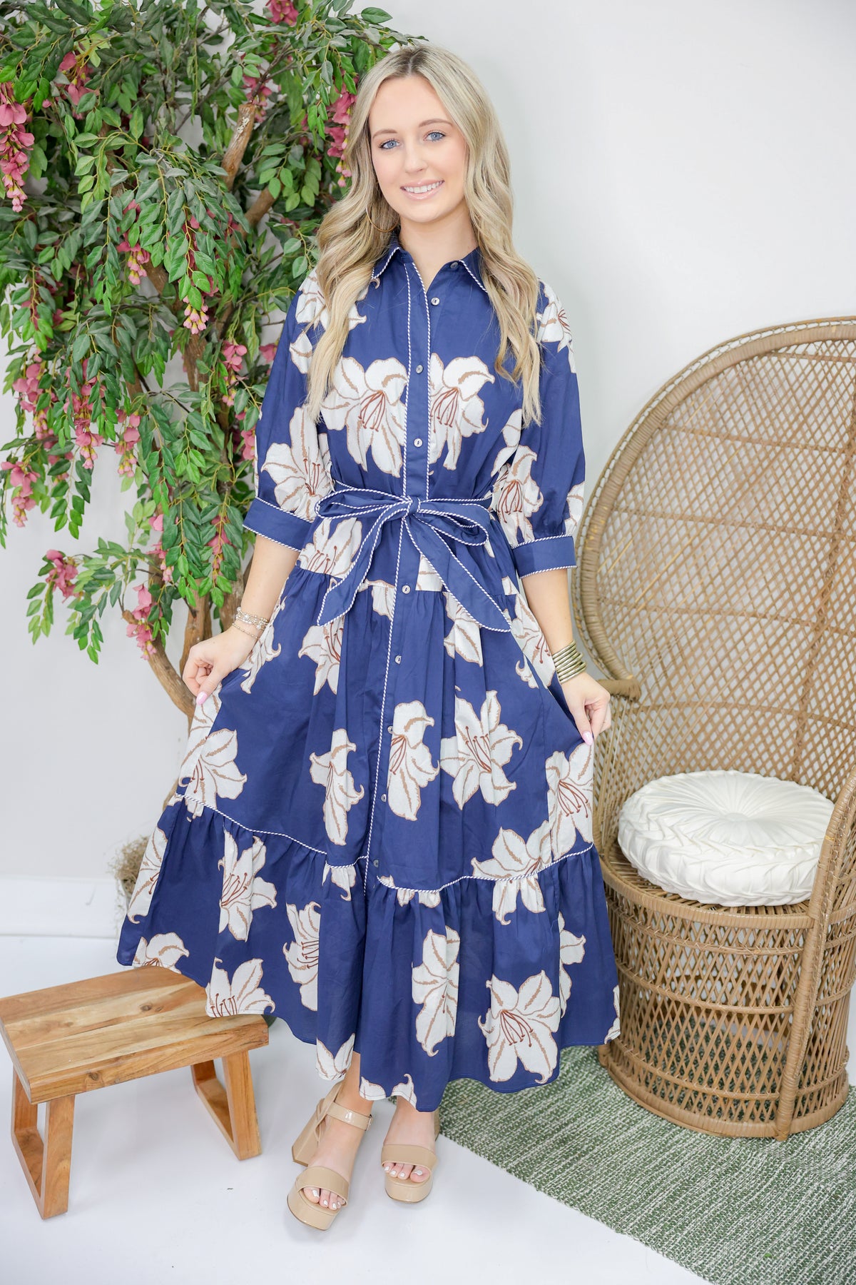 Embrace a playful vibe with the Demi Floral Print Midi Dress in navy. Featuring a charming floral pattern and a flattering midi length, this dress adds a touch of whimsy to any look. The 3/4 sleeves offer just the right amount of coverage, while the front tie detail creates a fun, flirty silhouette perfect for day or night.