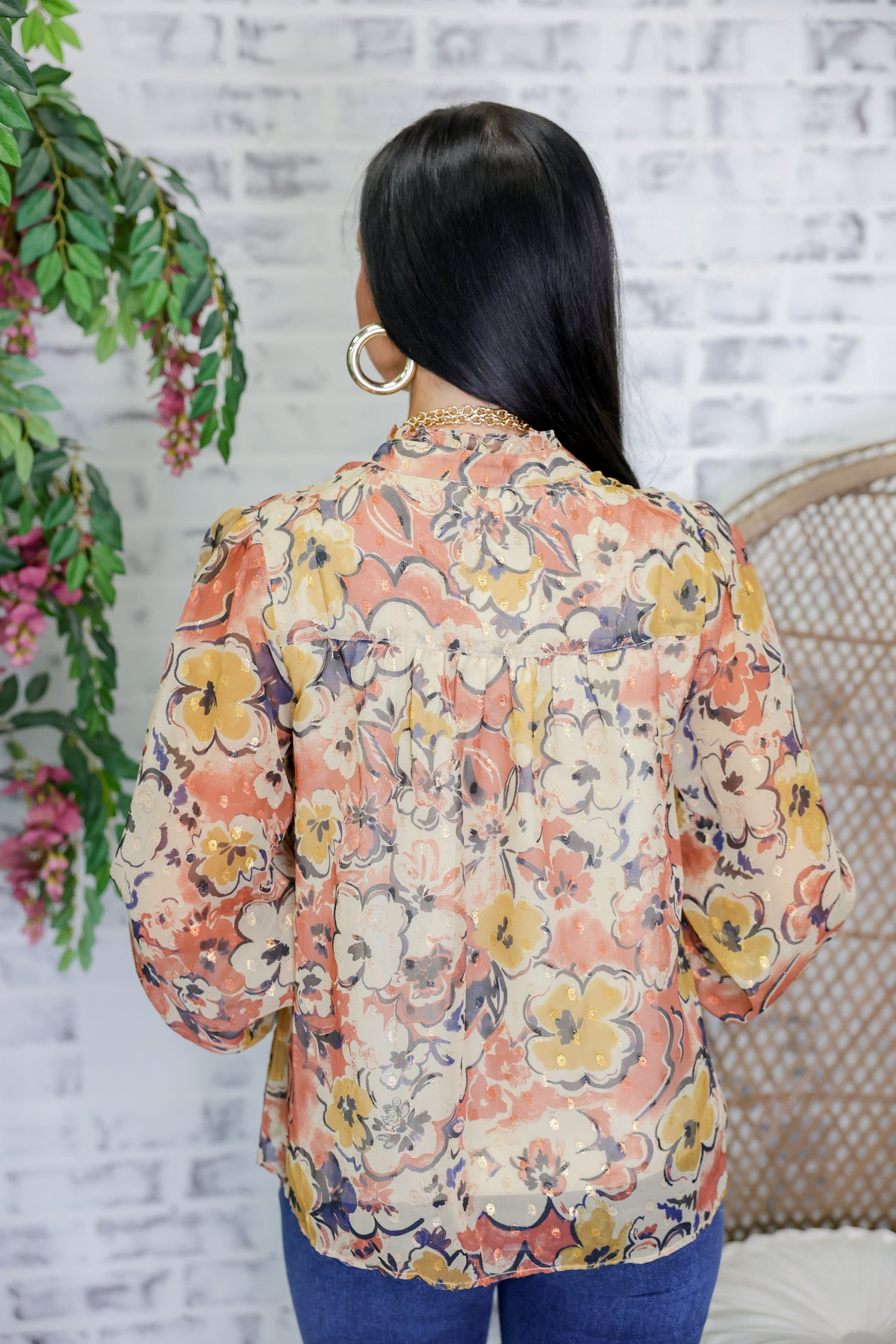 Floral Print w/ Lurex Chiffon Ruffled High Neckline Top "Beige Combo"