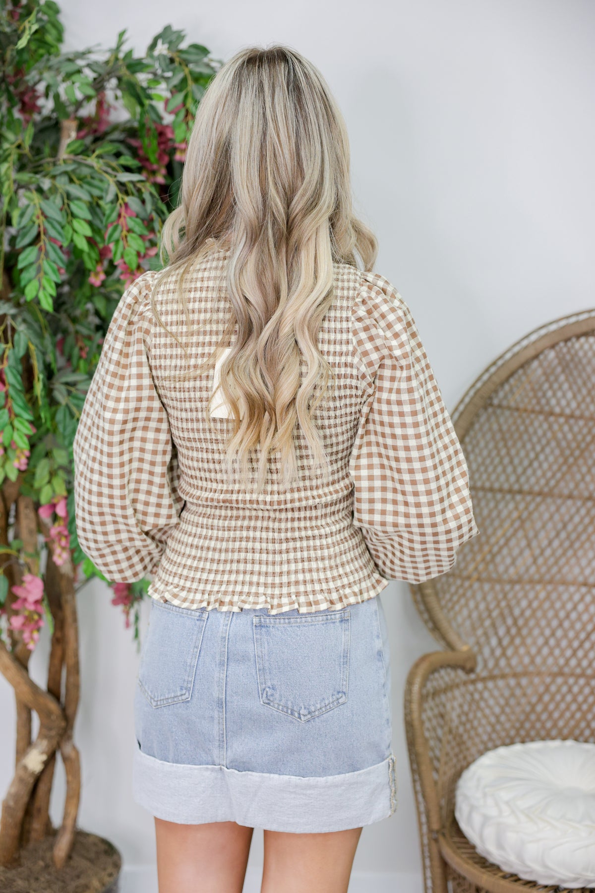 This playful gingham top in mocha features long puff sleeves for a flirty, vintage-inspired look. A convenient zipper adds a modern twist and easy wearability, making it perfect for day-to-night style. Light and lively, it’s an effortless way to brighten up your wardrobe.