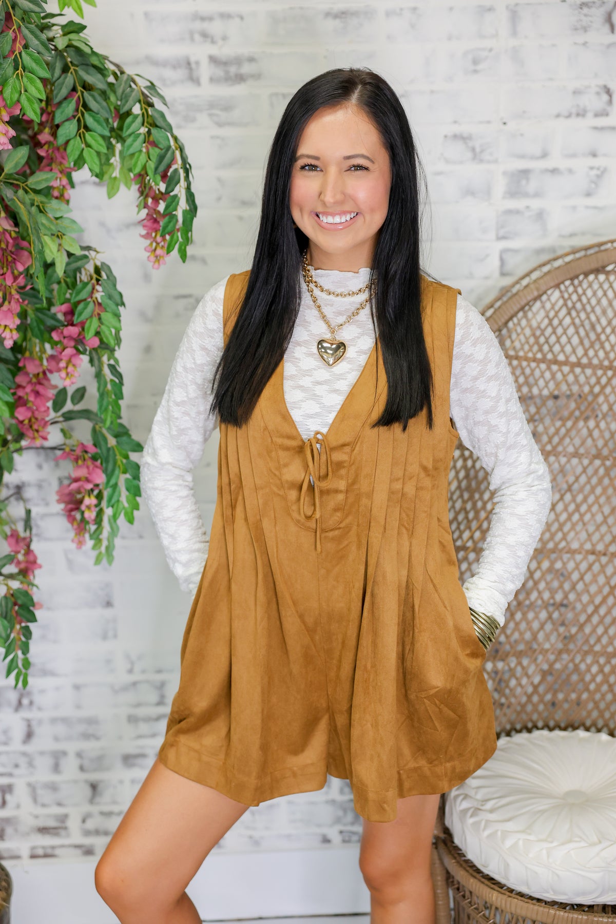 Slip into effortless elegance with the Velvet Muse Romper in a luxe taupe hue. This one-piece wonder features a charming front tie detail that lets you customize your fit and add a flirty touch to your look. Crafted from sumptuous velvet, it's the perfect blend of cozy comfort and sophisticated style—ideal for everything from casual outings to evening adventures. Make a statement without trying too hard.